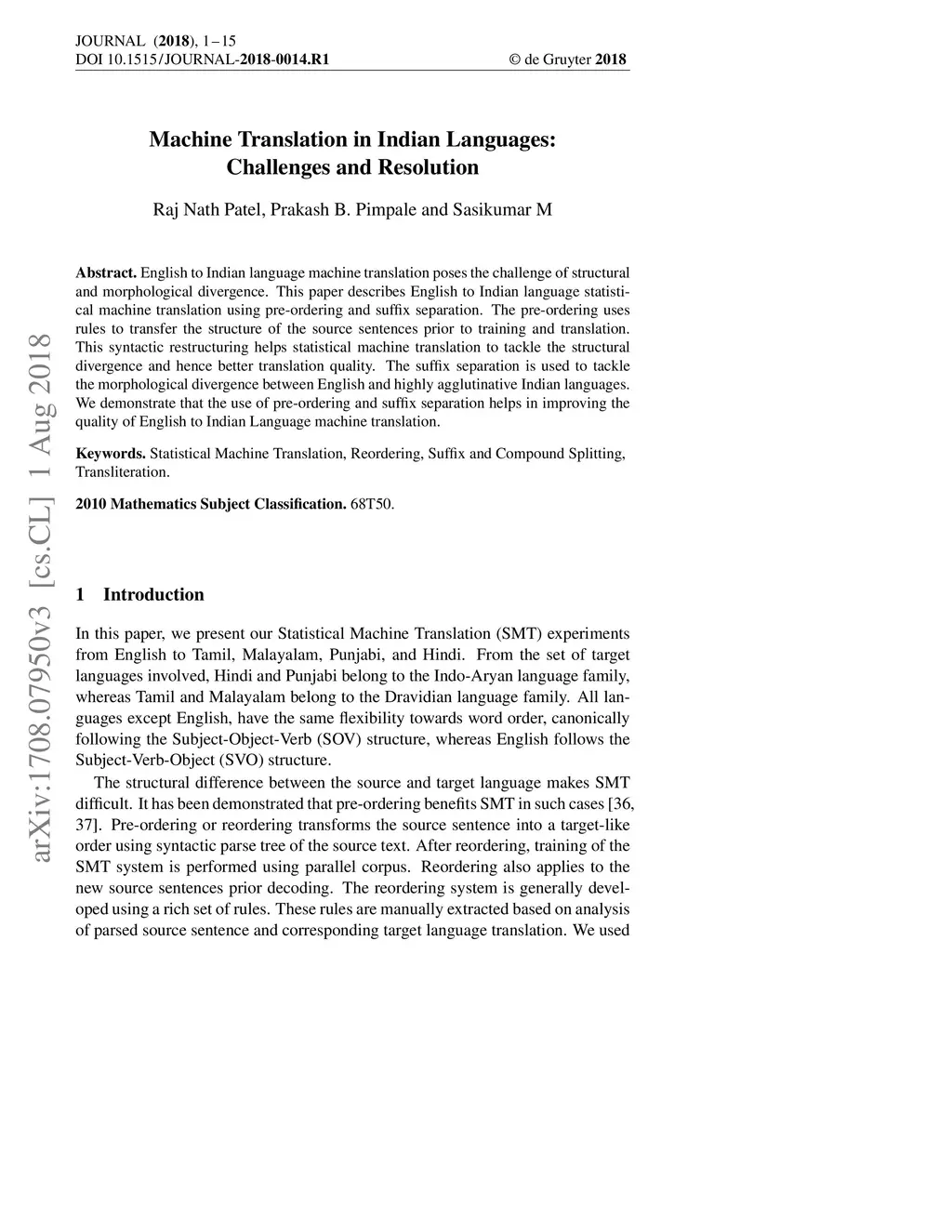 Machine Translation in Indian Languages: Challenges and Resolution
