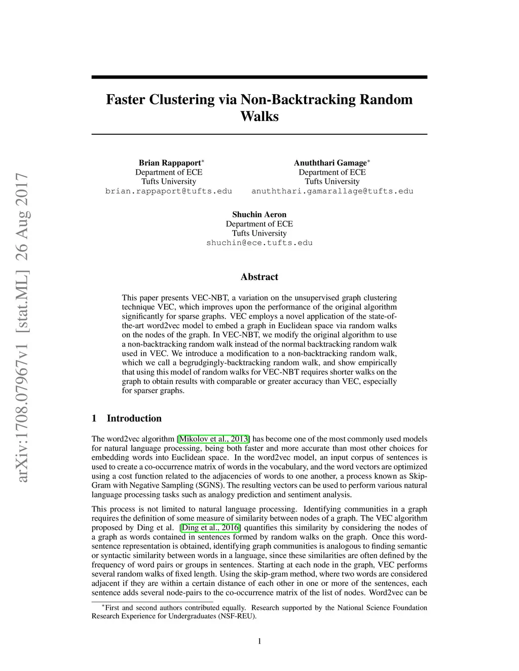This paper presents VEC-NBT, a variation on the unsupervised graph clustering technique VEC, which improves upon the performance of the original algorithm significantly for sparse graphs. VEC employs a novel application of the state-of-the-art word2vec model to embed a graph in Euclidean space via random walks on the nodes of the graph. In VEC-NBT, we modify the original algorithm to use a non-backtracking random walk instead of the normal backtracking random walk used in VEC. We introduce a modification to a non-backtracking random walk, which we call a begrudgingly-backtracking random walk, and show empirically that using this model of random walks for VEC-NBT requires shorter walks on the graph to obtain results with comparable or greater accuracy than VEC, especially for sparser graphs.