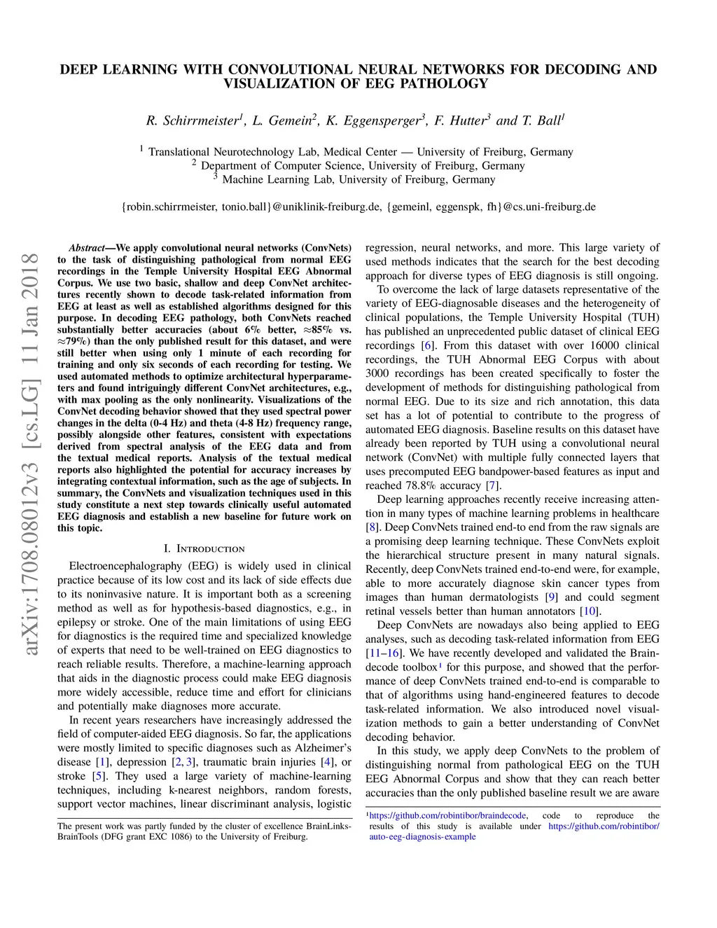 We apply convolutional neural networks (ConvNets) to the task of distinguishing pathological from normal EEG recordings in the Temple University Hospital EEG Abnormal Corpus. We use two basic, shallow and deep ConvNet architectures recently shown to decode task-related information from EEG at least as well as established algorithms designed for this purpose. In decoding EEG pathology, both ConvNets reached substantially better accuracies (about 6% better, ~85% vs. ~79%) than the only published result for this dataset, and were still better when using only 1 minute of each recording for training and only six seconds of each recording for testing. We used automated methods to optimize architectural hyperparameters and found intriguingly different ConvNet architectures, e.g., with max pooling as the only nonlinearity. Visualizations of the ConvNet decoding behavior showed that they used spectral power changes in the delta (0-4 Hz) and theta (4-8 Hz) frequency range, possibly alongside other features, consistent with expectations derived from spectral analysis of the EEG data and from the textual medical reports. Analysis of the textual medical reports also highlighted the potential for accuracy increases by integrating contextual information, such as the age of subjects. In summary, the ConvNets and visualization techniques used in this study constitute a next step towards clinically useful automated EEG diagnosis and establish a new baseline for future work on this topic.