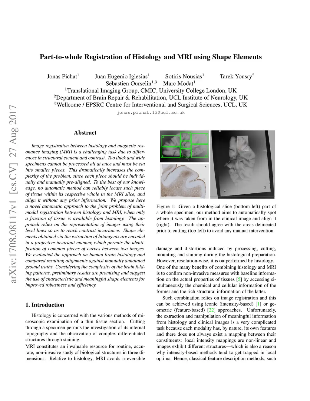 Part-to-whole Registration of Histology and MRI using Shape Elements