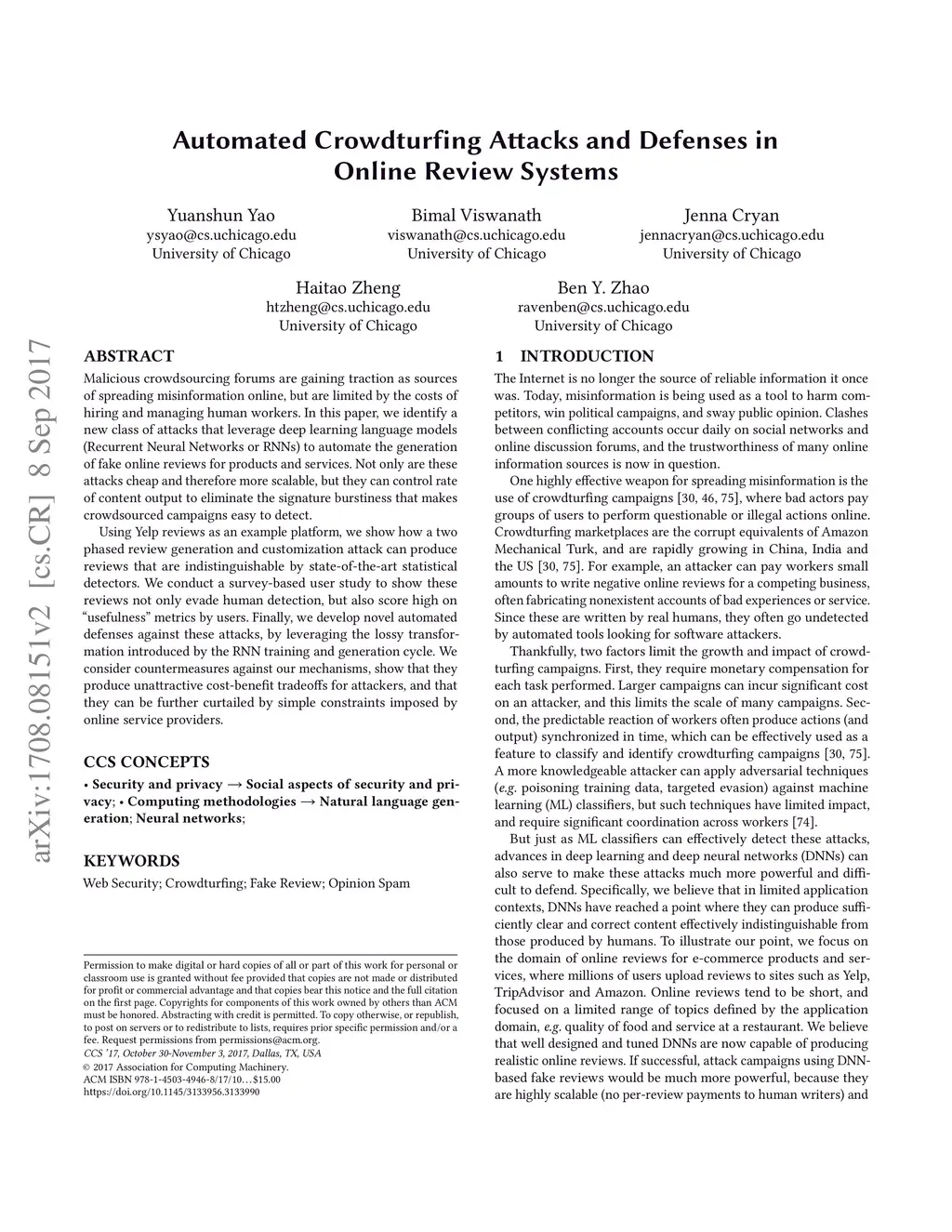 Malicious crowdsourcing forums are gaining traction as sources of spreading misinformation online, but are limited by the costs of hiring and managing human workers. In this paper, we identify a new class of attacks that leverage deep learning language models (Recurrent Neural Networks or RNNs) to automate the generation of fake online reviews for products and services. Not only are these attacks cheap and therefore more scalable, but they can control rate of content output to eliminate the signature burstiness that makes crowdsourced campaigns easy to detect. Using Yelp reviews as an example platform, we show how a two phased review generation and customization attack can produce reviews that are indistinguishable by state-of-the-art statistical detectors. We conduct a survey-based user study to show these reviews not only evade human detection, but also score high on "usefulness" metrics by users. Finally, we develop novel automated defenses against these attacks, by leveraging the lossy transformation introduced by the RNN training and generation cycle. We consider countermeasures against our mechanisms, show that they produce unattractive cost-benefit tradeoffs for attackers, and that they can be further curtailed by simple constraints imposed by online service providers.
