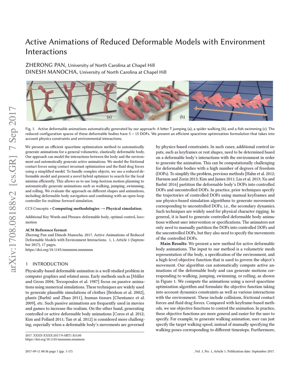 We present an efficient spacetime optimization method to automatically generate animations for a general volumetric, elastically deformable body. Our approach can model the interactions between the body and the environment and automatically generate active animations. We model the frictional contact forces using contact invariant optimization and the fluid drag forces using a simplified model. To handle complex objects, we use a reduced deformable model and present a novel hybrid optimizer to search for the local minima efficiently. This allows us to use long-horizon motion planning to automatically generate animations such as walking, jumping, swimming, and rolling. We evaluate the approach on different shapes and animations, including deformable body navigation and combining with an open-loop controller for realtime forward simulation.
