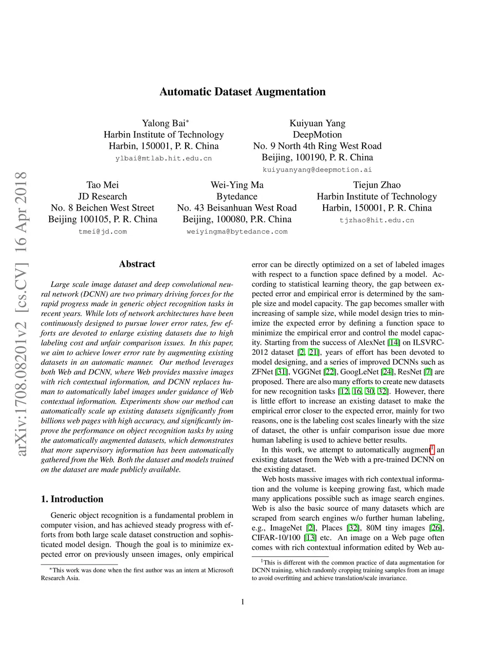 Large scale image dataset and deep convolutional neural network (DCNN) are two primary driving forces for the rapid progress made in generic object recognition tasks in recent years. While lots of network architectures have been continuously designed to pursue lower error rates, few efforts are devoted to enlarge existing datasets due to high labeling cost and unfair comparison issues. In this paper, we aim to achieve lower error rate by augmenting existing datasets in an automatic manner. Our method leverages both Web and DCNN, where Web provides massive images with rich contextual information, and DCNN replaces human to automatically label images under guidance of Web contextual information. Experiments show our method can automatically scale up existing datasets significantly from billions web pages with high accuracy, and significantly improve the performance on object recognition tasks by using the automatically augmented datasets, which demonstrates that more supervisory information has been automatically gathered from the Web. Both the dataset and models trained on the dataset are made publicly available.