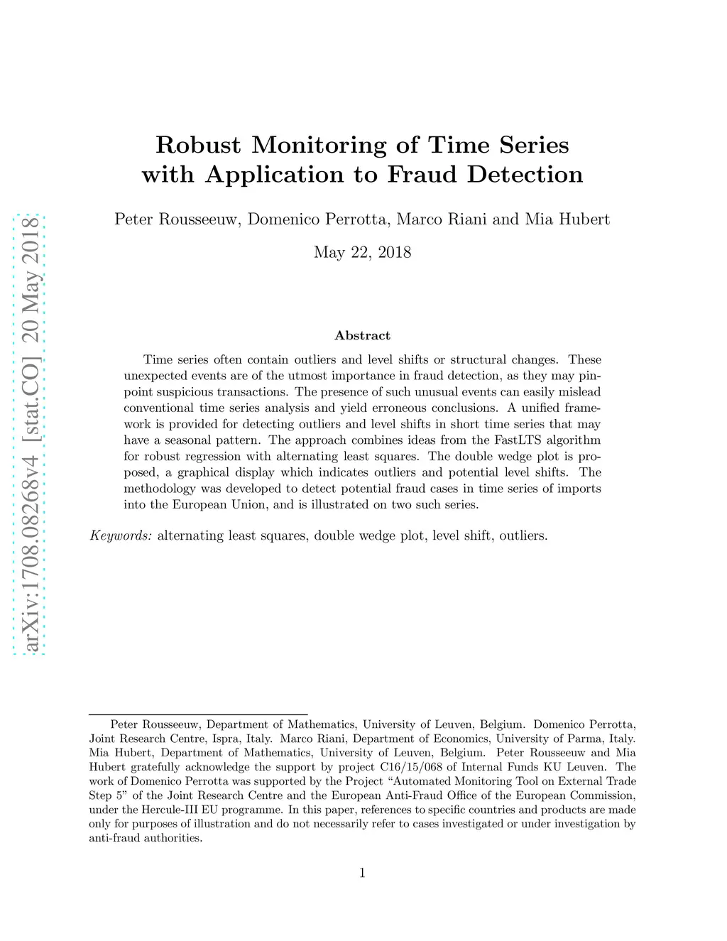 Time series often contain outliers and level shifts or structural changes. These unexpected events are of the utmost importance in fraud detection, as they may pinpoint suspicious transactions. The presence of such unusual events can easily mislead conventional time series analysis and yield erroneous conclusions. In this paper we provide a unified framework for detecting outliers and level shifts in short time series that may have a seasonal pattern. The approach combines ideas from the FastLTS algorithm for robust regression with alternating least squares. The double wedge plot is proposed, a graphical display which indicates outliers and potential level shifts. The methodology was developed to detect potential fraud cases in time series of imports into the European Union, and is illustrated on two such series.