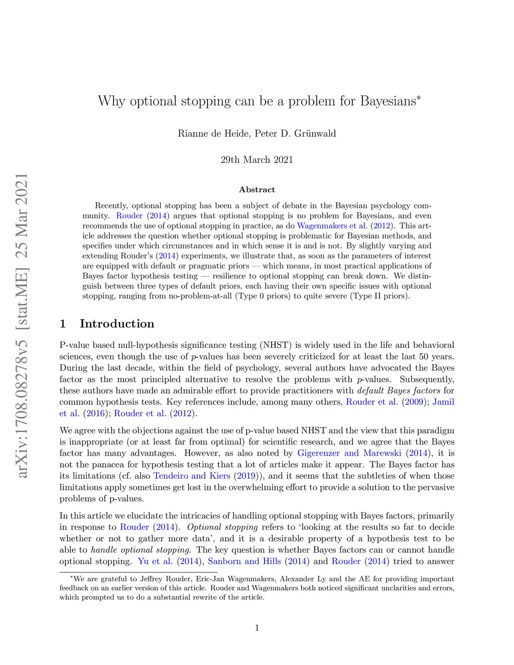 Recently, optional stopping has been a subject of debate in the Bayesian psychology community. Rouder (2014) argues that optional stopping is no problem for Bayesians, and even recommends the use of optional stopping in practice, as do Wagenmakers et al. (2012). This article addresses the question whether optional stopping is problematic for Bayesian methods, and specifies under which circumstances and in which sense it is and is not. By slightly varying and extending Rouder's (2014) experiment, we illustrate that, as soon as the parameters of interest are equipped with default or pragmatic priors - which means, in most practical applications of Bayes Factor hypothesis testing - resilience to optional stopping can break down. We distinguish between four types of default priors, each having their own specific issues with optional stopping, ranging from no-problem-at-all (Type 0 priors) to quite severe (Type II and III priors).