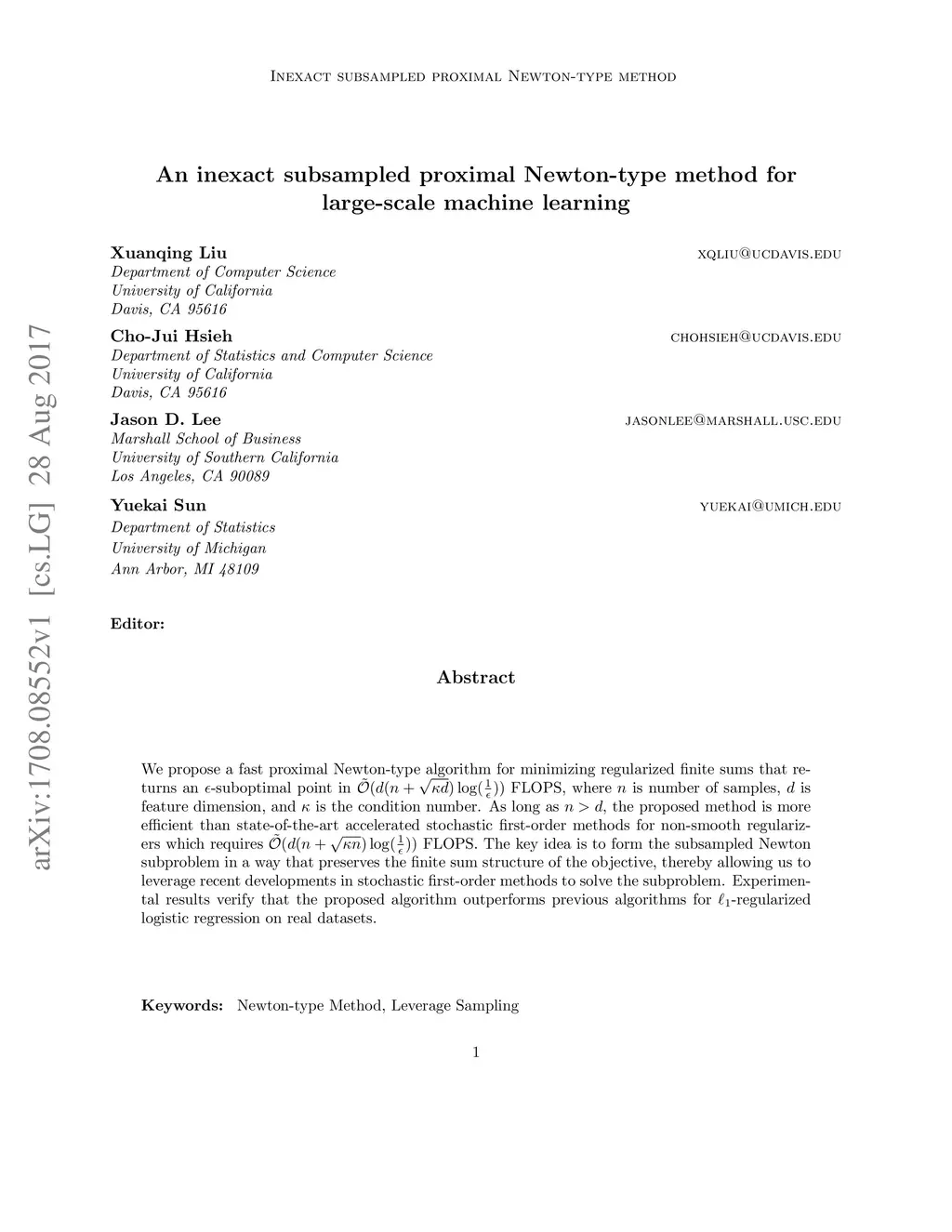 We propose a fast proximal Newton-type algorithm for minimizing regularized finite sums that returns an -suboptimal point in FLOPS, where is number of samples, is feature dimension, and is the condition number. As long as , the proposed method is more efficient than state-of-the-art accelerated stochastic first-order methods for non-smooth regularizers which requires FLOPS. The key idea is to form the subsampled Newton subproblem in a way that preserves the finite sum structure of the objective, thereby allowing us to leverage recent developments in stochastic first-order methods to solve the subproblem. Experimental results verify that the proposed algorithm outperforms previous algorithms for -regularized logistic regression on real datasets.