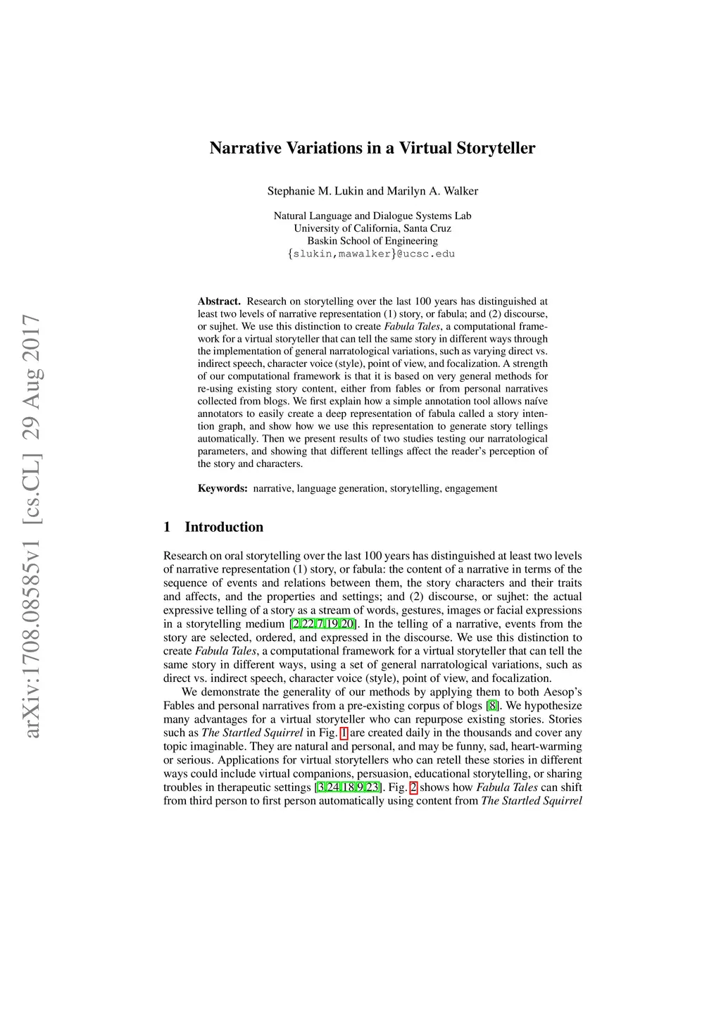 Research on storytelling over the last 100 years has distinguished at least two levels of narrative representation (1) story, or fabula; and (2) discourse, or sujhet. We use this distinction to create Fabula Tales, a computational framework for a virtual storyteller that can tell the same story in different ways through the implementation of general narratological variations, such as varying direct vs. indirect speech, character voice (style), point of view, and focalization. A strength of our computational framework is that it is based on very general methods for re-using existing story content, either from fables or from personal narratives collected from blogs. We first explain how a simple annotation tool allows naive annotators to easily create a deep representation of fabula called a story intention graph, and show how we use this representation to generate story tellings automatically. Then we present results of two studies testing our narratological parameters, and showing that different tellings affect the reader's perception of the story and characters.