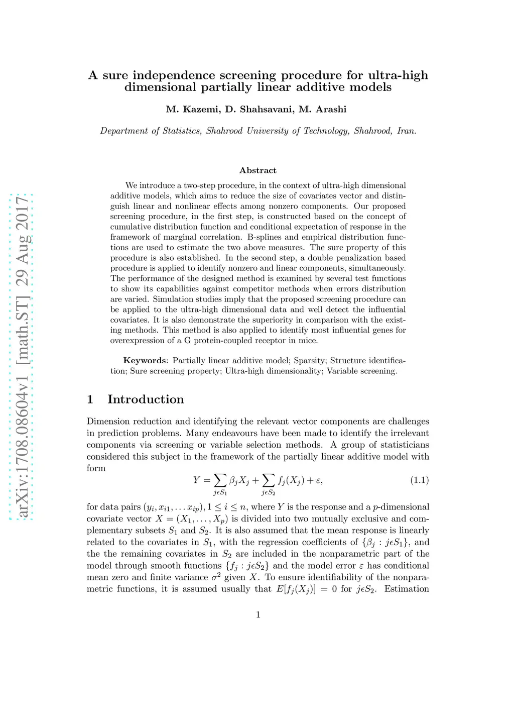 We introduce a two-step procedure, in the context of ultra-high dimensional additive models, which aims to reduce the size of covariates vector and distinguish linear and nonlinear effects among nonzero components. Our proposed screening procedure, in the first step, is constructed based on the concept of cumulative distribution function and conditional expectation of response in the framework of marginal correlation. B-splines and empirical distribution functions are used to estimate the two above measures. The sure property of this procedure is also established. In the second step, a double penalization based procedure is applied to identify nonzero and linear components, simultaneously. The performance of the designed method is examined by several test functions to show its capabilities against competitor methods when errors distribution are varied. Simulation studies imply that the proposed screening procedure can be applied to the ultra-high dimensional data and well detect the in uential covariates. It is also demonstrate the superiority in comparison with the existing methods. This method is also applied to identify most in uential genes for overexpression of a G protein-coupled receptor in mice.