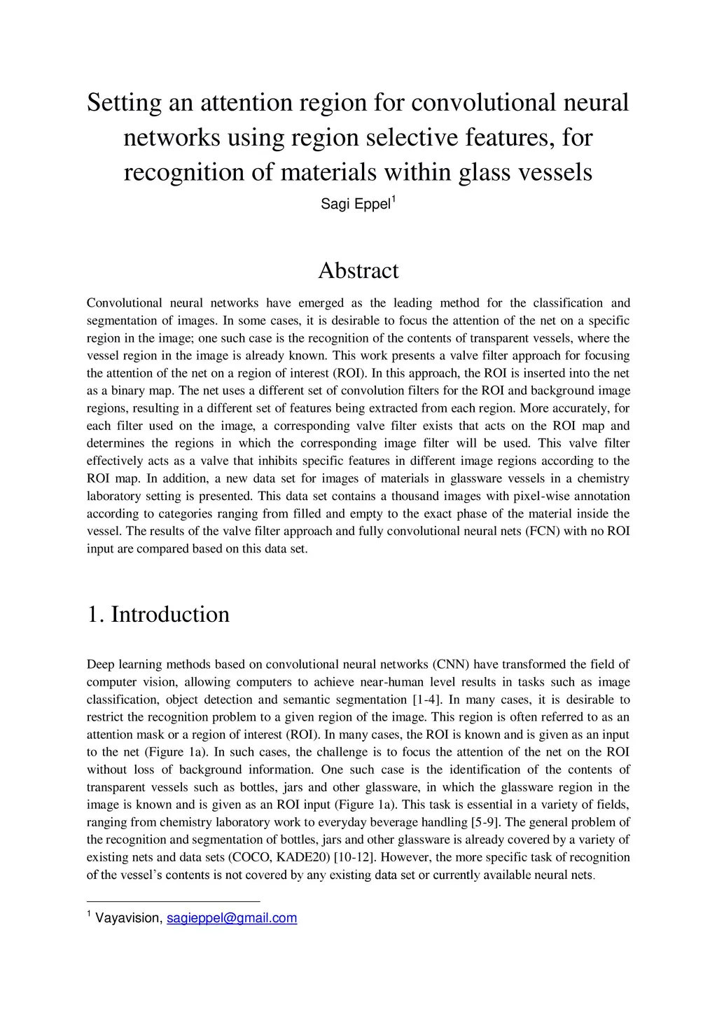 Convolutional neural networks have emerged as the leading method for the classification and segmentation of images. In some cases, it is desirable to focus the attention of the net on a specific region in the image; one such case is the recognition of the contents of transparent vessels, where the vessel region in the image is already known. This work presents a valve filter approach for focusing the attention of the net on a region of interest (ROI). In this approach, the ROI is inserted into the net as a binary map. The net uses a different set of convolution filters for the ROI and background image regions, resulting in a different set of features being extracted from each region. More accurately, for each filter used on the image, a corresponding valve filter exists that acts on the ROI map and determines the regions in which the corresponding image filter will be used. This valve filter effectively acts as a valve that inhibits specific features in different image regions according to the ROI map. In addition, a new data set for images of materials in glassware vessels in a chemistry laboratory setting is presented. This data set contains a thousand images with pixel-wise annotation according to categories ranging from filled and empty to the exact phase of the material inside the vessel. The results of the valve filter approach and fully convolutional neural nets (FCN) with no ROI input are compared based on this data set.