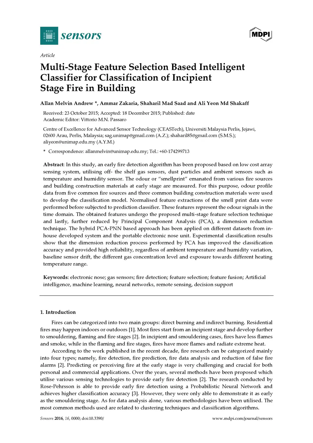 In this study, an early fire detection algorithm has been proposed based on low cost array sensing system, utilizing gas sensors, dust particles and ambient sensors such as temperature and humidity sensor. The odor or smell-print emanated from various fire sources and building construction materials at early stage are measured. For this purpose, odor profile data from five common fire sources and three common building construction materials were used to develop the classification model. Normalized feature extractions of the smell print data were performed before subjected to prediction classifier. These features represent the odor signals in the time domain. The obtained features undergo the proposed multi-stage feature selection technique and lastly, further reduced by Principal Component Analysis (PCA), a dimension reduction technique. The hybrid PCA-PNN based approach has been applied on different datasets from in-house developed system and the portable electronic nose unit. Experimental classification results show that the dimension reduction process performed by PCA has improved the classification accuracy and provided high reliability, regardless of ambient temperature and humidity variation, baseline sensor drift, the different gas concentration level and exposure towards different heating temperature range.