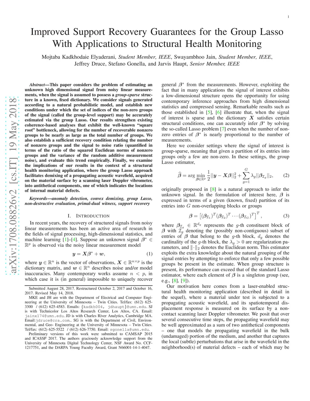 This paper considers the problem of estimating an unknown high dimensional signal from noisy linear measurements, {when} the signal is assumed to possess a \emph{group-sparse} structure in a {known,} fixed dictionary. We consider signals generated according to a natural probabilistic model, and establish new conditions under which the set of indices of the non-zero groups of the signal (called the group-level support) may be accurately estimated via the group Lasso. Our results strengthen existing coherence-based analyses that exhibit the well-known "square root" bottleneck, allowing for the number of recoverable nonzero groups to be nearly as large as the total number of groups. We also establish a sufficient recovery condition relating the number of nonzero groups and the signal to noise ratio (quantified in terms of the ratio of the squared Euclidean norms of nonzero groups and the variance of the random additive {measurement} noise), and validate this trend empirically. Finally, we examine the implications of our results in the context of a structural health monitoring application, where the group Lasso approach facilitates demixing of a propagating acoustic wavefield, acquired on the material surface by a scanning laser Doppler vibrometer, into antithetical components, one of which indicates the locations of internal material defects.