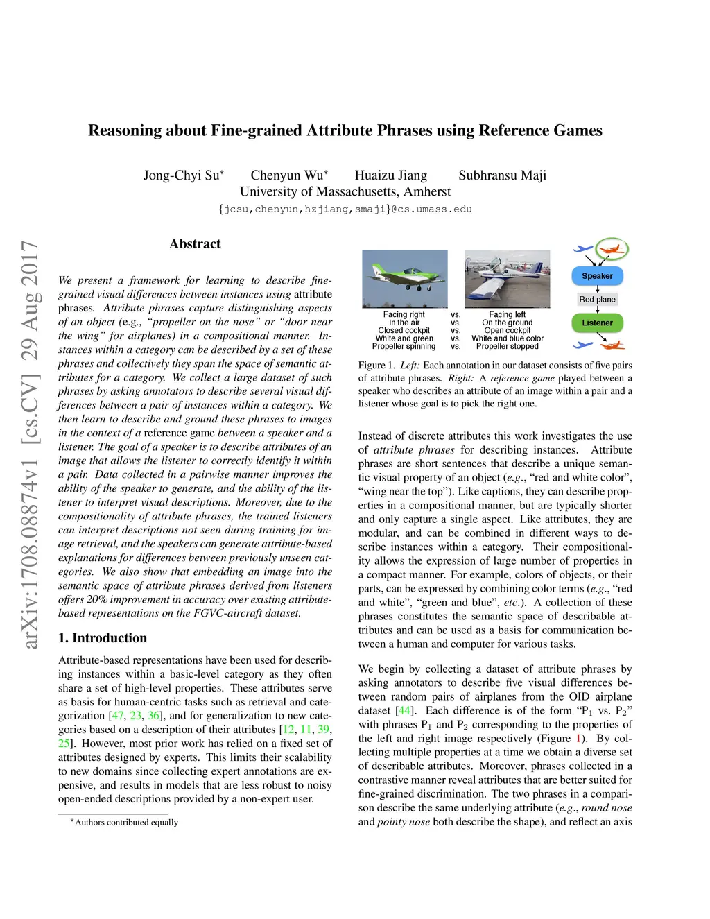 We present a framework for learning to describe fine-grained visual differences between instances using attribute phrases. Attribute phrases capture distinguishing aspects of an object (e.g., "propeller on the nose" or "door near the wing" for airplanes) in a compositional manner. Instances within a category can be described by a set of these phrases and collectively they span the space of semantic attributes for a category. We collect a large dataset of such phrases by asking annotators to describe several visual differences between a pair of instances within a category. We then learn to describe and ground these phrases to images in the context of a *reference game* between a speaker and a listener. The goal of a speaker is to describe attributes of an image that allows the listener to correctly identify it within a pair. Data collected in a pairwise manner improves the ability of the speaker to generate, and the ability of the listener to interpret visual descriptions. Moreover, due to the compositionality of attribute phrases, the trained listeners can interpret descriptions not seen during training for image retrieval, and the speakers can generate attribute-based explanations for differences between previously unseen categories. We also show that embedding an image into the semantic space of attribute phrases derived from listeners offers 20% improvement in accuracy over existing attribute-based representations on the FGVC-aircraft dataset.