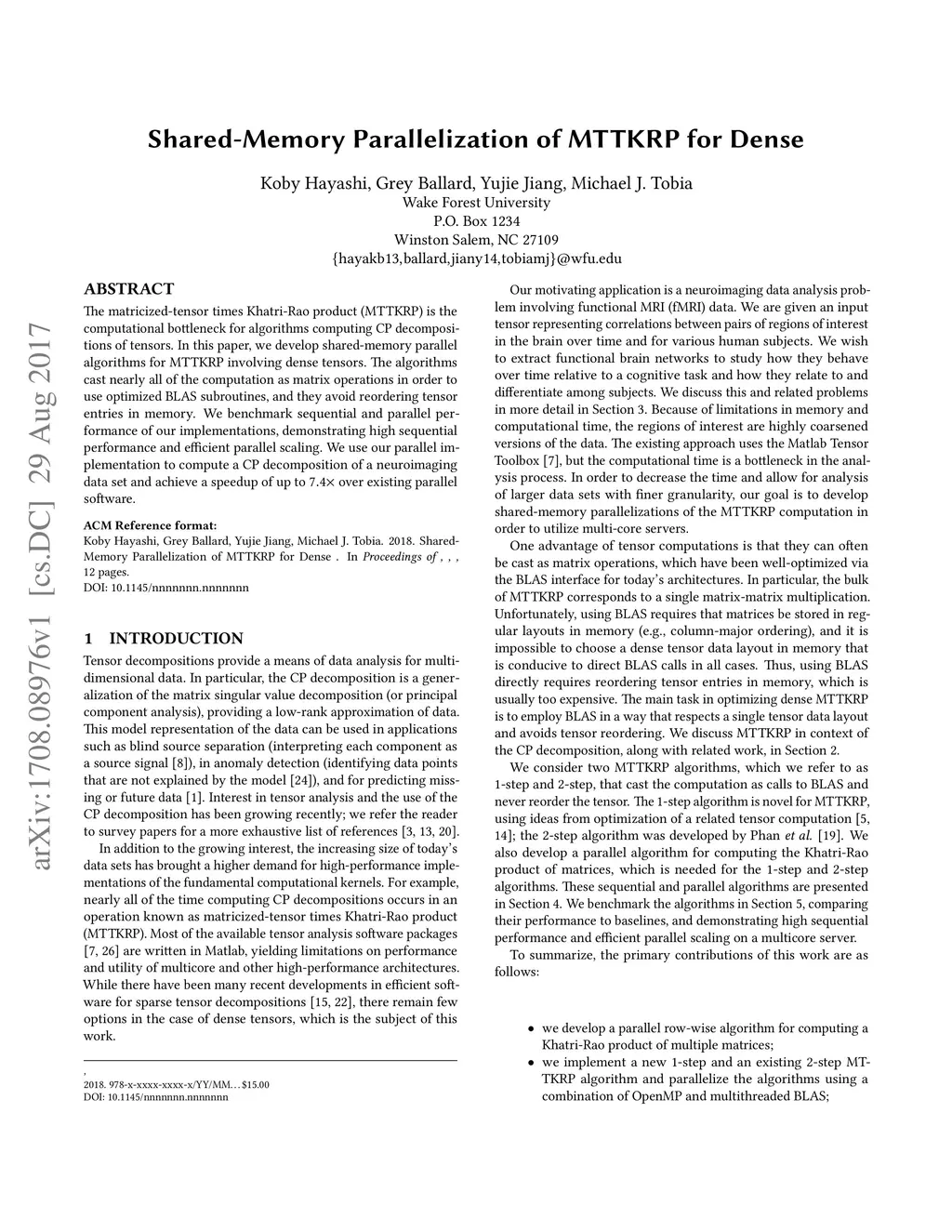 The matricized-tensor times Khatri-Rao product (MTTKRP) is the computational bottleneck for algorithms computing CP decompositions of tensors. In this paper, we develop shared-memory parallel algorithms for MTTKRP involving dense tensors. The algorithms cast nearly all of the computation as matrix operations in order to use optimized BLAS subroutines, and they avoid reordering tensor entries in memory. We benchmark sequential and parallel performance of our implementations, demonstrating high sequential performance and efficient parallel scaling. We use our parallel implementation to compute a CP decomposition of a neuroimaging data set and achieve a speedup of up to over existing parallel software.