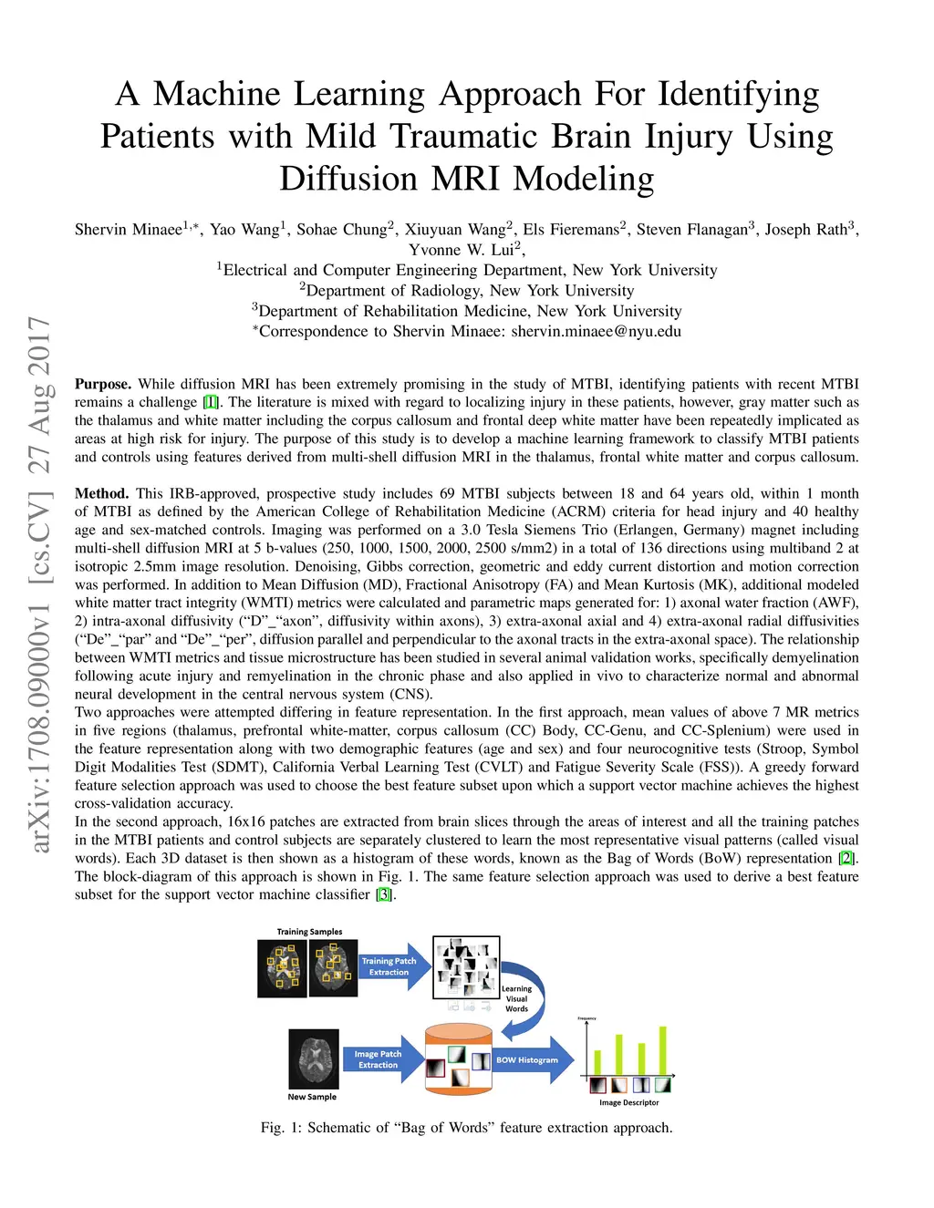 While diffusion MRI has been extremely promising in the study of MTBI, identifying patients with recent MTBI remains a challenge. The literature is mixed with regard to localizing injury in these patients, however, gray matter such as the thalamus and white matter including the corpus callosum and frontal deep white matter have been repeatedly implicated as areas at high risk for injury. The purpose of this study is to develop a machine learning framework to classify MTBI patients and controls using features derived from multi-shell diffusion MRI in the thalamus, frontal white matter and corpus callosum.