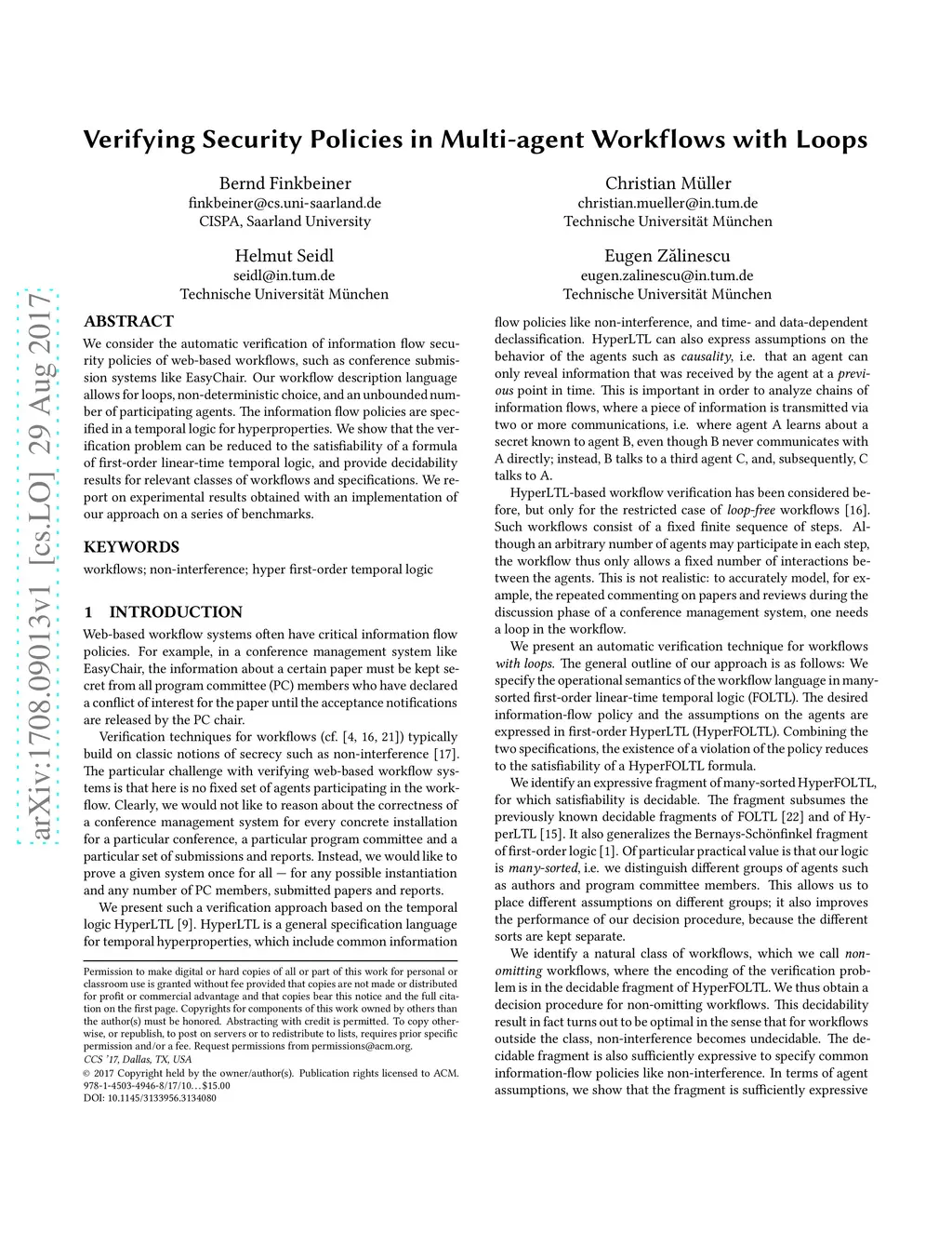 We consider the automatic verification of information flow security policies of web-based workflows, such as conference submission systems like EasyChair. Our workflow description language allows for loops, non-deterministic choice, and an unbounded number of participating agents. The information flow policies are specified in a temporal logic for hyperproperties. We show that the verification problem can be reduced to the satisfiability of a formula of first-order linear-time temporal logic, and provide decidability results for relevant classes of workflows and specifications. We report on experimental results obtained with an implementation of our approach on a series of benchmarks.