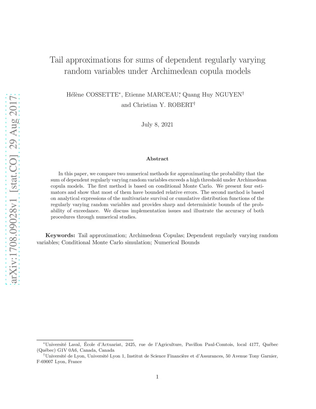 In this paper, we compare two numerical methods for approximating the probability that the sum of dependent regularly varying random variables exceeds a high threshold under Archimedean copula models. The first method is based on conditional Monte Carlo. We present four estimators and show that most of them have bounded relative errors. The second method is based on analytical expressions of the multivariate survival or cumulative distribution functions of the regularly varying random variables and provides sharp and deterministic bounds of the probability of exceedance. We discuss implementation issues and illustrate the accuracy of both procedures through numerical studies.