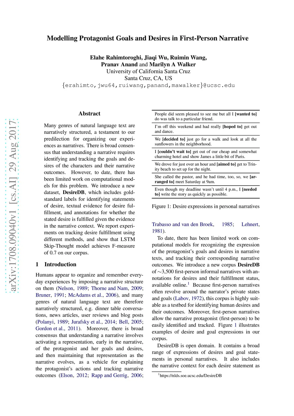 Many genres of natural language text are narratively structured, a testament to our predilection for organizing our experiences as narratives. There is broad consensus that understanding a narrative requires identifying and tracking the goals and desires of the characters and their narrative outcomes. However, to date, there has been limited work on computational models for this problem. We introduce a new dataset, DesireDB, which includes gold-standard labels for identifying statements of desire, textual evidence for desire fulfillment, and annotations for whether the stated desire is fulfilled given the evidence in the narrative context. We report experiments on tracking desire fulfillment using different methods, and show that LSTM Skip-Thought model achieves F-measure of 0.7 on our corpus.