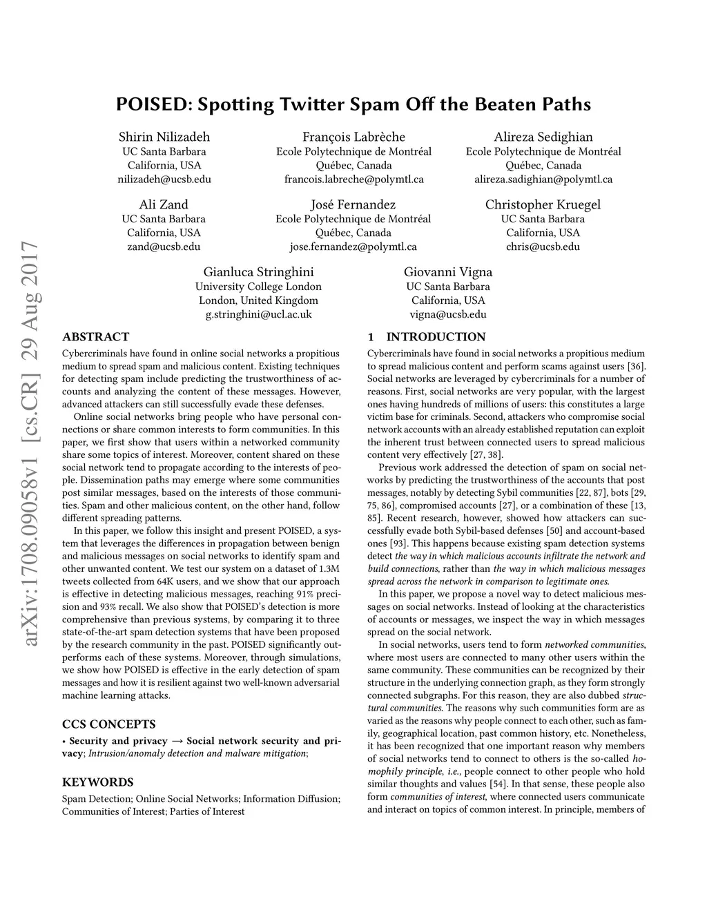 Cybercriminals have found in online social networks a propitious medium to spread spam and malicious content. Existing techniques for detecting spam include predicting the trustworthiness of accounts and analyzing the content of these messages. However, advanced attackers can still successfully evade these defenses. Online social networks bring people who have personal connections or share common interests to form communities. In this paper, we first show that users within a networked community share some topics of interest. Moreover, content shared on these social network tend to propagate according to the interests of people. Dissemination paths may emerge where some communities post similar messages, based on the interests of those communities. Spam and other malicious content, on the other hand, follow different spreading patterns. In this paper, we follow this insight and present POISED, a system that leverages the differences in propagation between benign and malicious messages on social networks to identify spam and other unwanted content. We test our system on a dataset of 1.3M tweets collected from 64K users, and we show that our approach is effective in detecting malicious messages, reaching 91% precision and 93% recall. We also show that POISED's detection is more comprehensive than previous systems, by comparing it to three state-of-the-art spam detection systems that have been proposed by the research community in the past. POISED significantly outperforms each of these systems. Moreover, through simulations, we show how POISED is effective in the early detection of spam messages and how it is resilient against two well-known adversarial machine learning attacks.