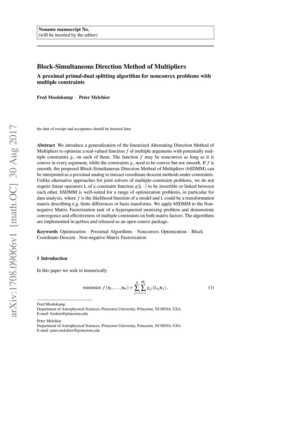 We introduce a generalization of the linearized Alternating Direction Method of Multipliers to optimize a real-valued function of multiple arguments with potentially multiple constraints on each of them. The function may be nonconvex as long as it is convex in every argument, while the constraints need to be convex but not smooth. If is smooth, the proposed Block-Simultaneous Direction Method of Multipliers (bSDMM) can be interpreted as a proximal analog to inexact coordinate descent methods under constraints. Unlike alternative approaches for joint solvers of multiple-constraint problems, we do not require linear operators of a constraint function to be invertible or linked between each other. bSDMM is well-suited for a range of optimization problems, in particular for data analysis, where is the likelihood function of a model and could be a transformation matrix describing e.g. finite differences or basis transforms. We apply bSDMM to the Non-negative Matrix Factorization task of a hyperspectral unmixing problem and demonstrate convergence and effectiveness of multiple constraints on both matrix factors. The algorithms are implemented in python and released as an open-source package.