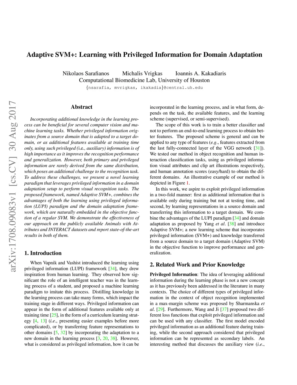 Incorporating additional knowledge in the learning process can be beneficial for several computer vision and machine learning tasks. Whether privileged information originates from a source domain that is adapted to a target domain, or as additional features available at training time only, using such privileged (i.e., auxiliary) information is of high importance as it improves the recognition performance and generalization. However, both primary and privileged information are rarely derived from the same distribution, which poses an additional challenge to the recognition task. To address these challenges, we present a novel learning paradigm that leverages privileged information in a domain adaptation setup to perform visual recognition tasks. The proposed framework, named Adaptive SVM+, combines the advantages of both the learning using privileged information (LUPI) paradigm and the domain adaptation framework, which are naturally embedded in the objective function of a regular SVM. We demonstrate the effectiveness of our approach on the publicly available Animals with Attributes and INTERACT datasets and report state-of-the-art results in both of them.