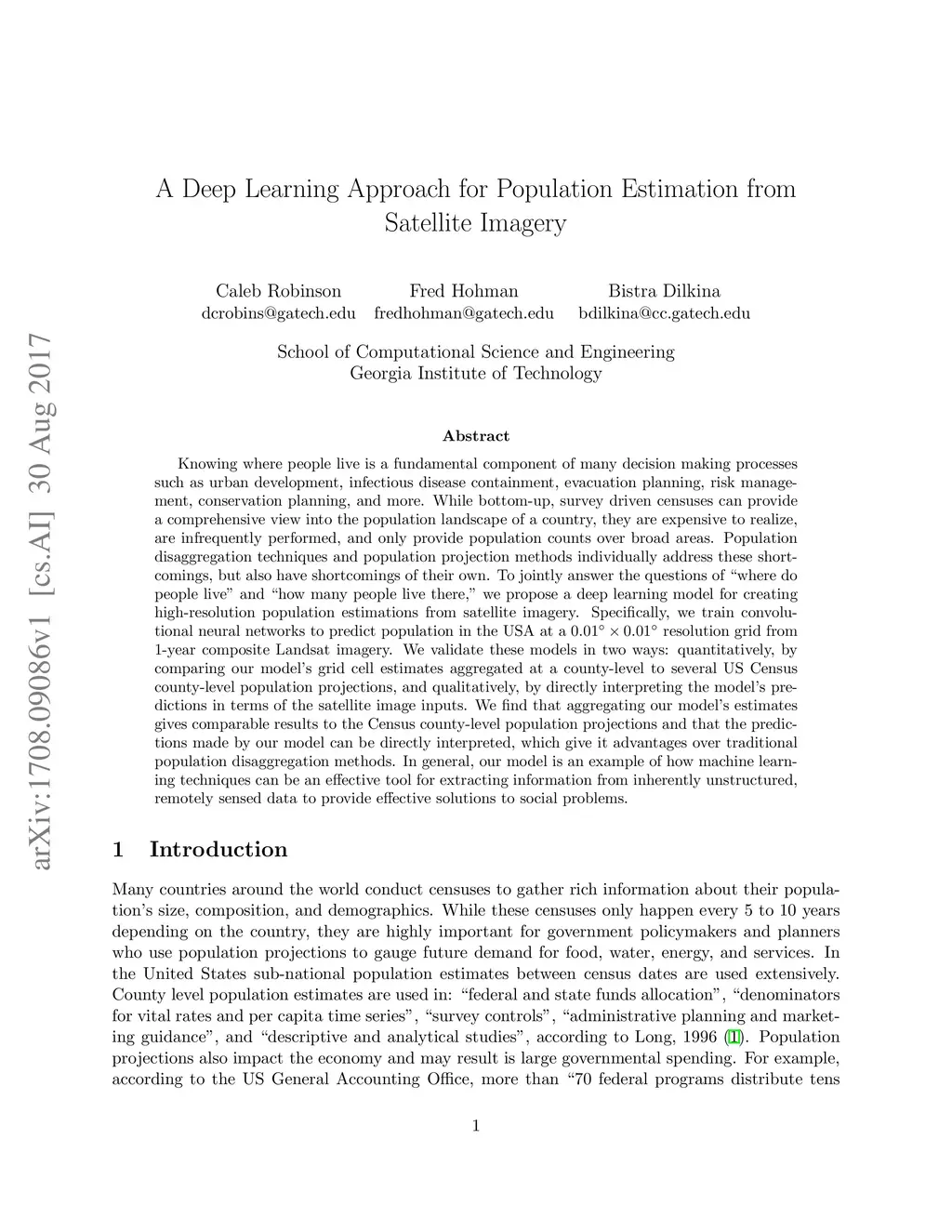 Knowing where people live is a fundamental component of many decision making processes such as urban development, infectious disease containment, evacuation planning, risk management, conservation planning, and more. While bottom-up, survey driven censuses can provide a comprehensive view into the population landscape of a country, they are expensive to realize, are infrequently performed, and only provide population counts over broad areas. Population disaggregation techniques and population projection methods individually address these shortcomings, but also have shortcomings of their own. To jointly answer the questions of "where do people live" and "how many people live there," we propose a deep learning model for creating high-resolution population estimations from satellite imagery. Specifically, we train convolutional neural networks to predict population in the USA at a resolution grid from 1-year composite Landsat imagery. We validate these models in two ways: quantitatively, by comparing our model's grid cell estimates aggregated at a county-level to several US Census county-level population projections, and qualitatively, by directly interpreting the model's predictions in terms of the satellite image inputs. We find that aggregating our model's estimates gives comparable results to the Census county-level population projections and that the predictions made by our model can be directly interpreted, which give it advantages over traditional population disaggregation methods. In general, our model is an example of how machine learning techniques can be an effective tool for extracting information from inherently unstructured, remotely sensed data to provide effective solutions to social problems.