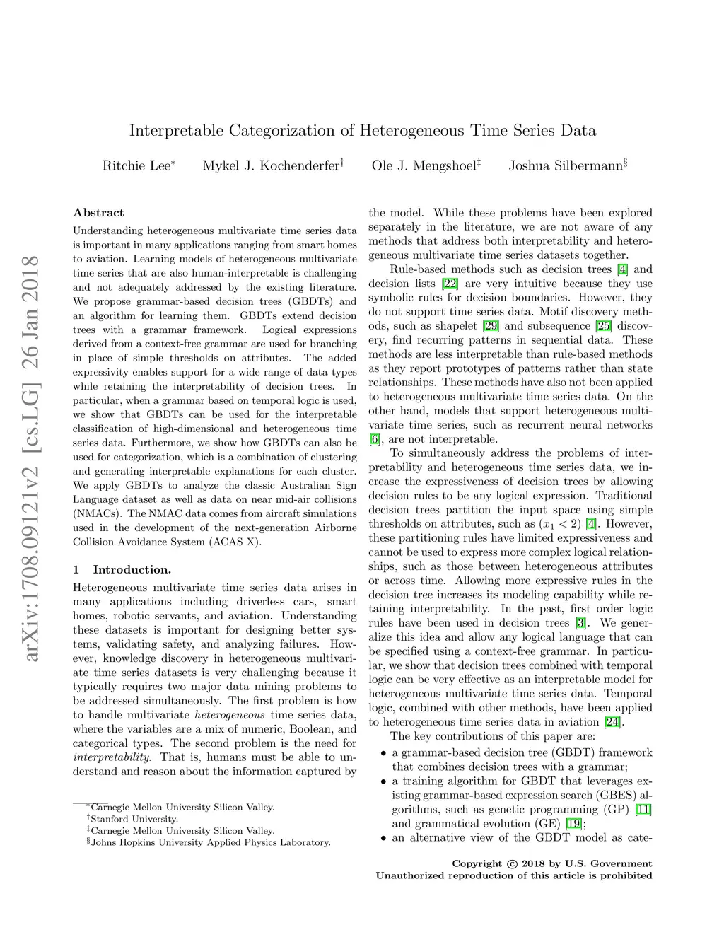 Understanding heterogeneous multivariate time series data is important in many applications ranging from smart homes to aviation. Learning models of heterogeneous multivariate time series that are also human-interpretable is challenging and not adequately addressed by the existing literature. We propose grammar-based decision trees (GBDTs) and an algorithm for learning them. GBDTs extend decision trees with a grammar framework. Logical expressions derived from a context-free grammar are used for branching in place of simple thresholds on attributes. The added expressivity enables support for a wide range of data types while retaining the interpretability of decision trees. In particular, when a grammar based on temporal logic is used, we show that GBDTs can be used for the interpretable classi cation of high-dimensional and heterogeneous time series data. Furthermore, we show how GBDTs can also be used for categorization, which is a combination of clustering and generating interpretable explanations for each cluster. We apply GBDTs to analyze the classic Australian Sign Language dataset as well as data on near mid-air collisions (NMACs). The NMAC data comes from aircraft simulations used in the development of the next-generation Airborne Collision Avoidance System (ACAS X).