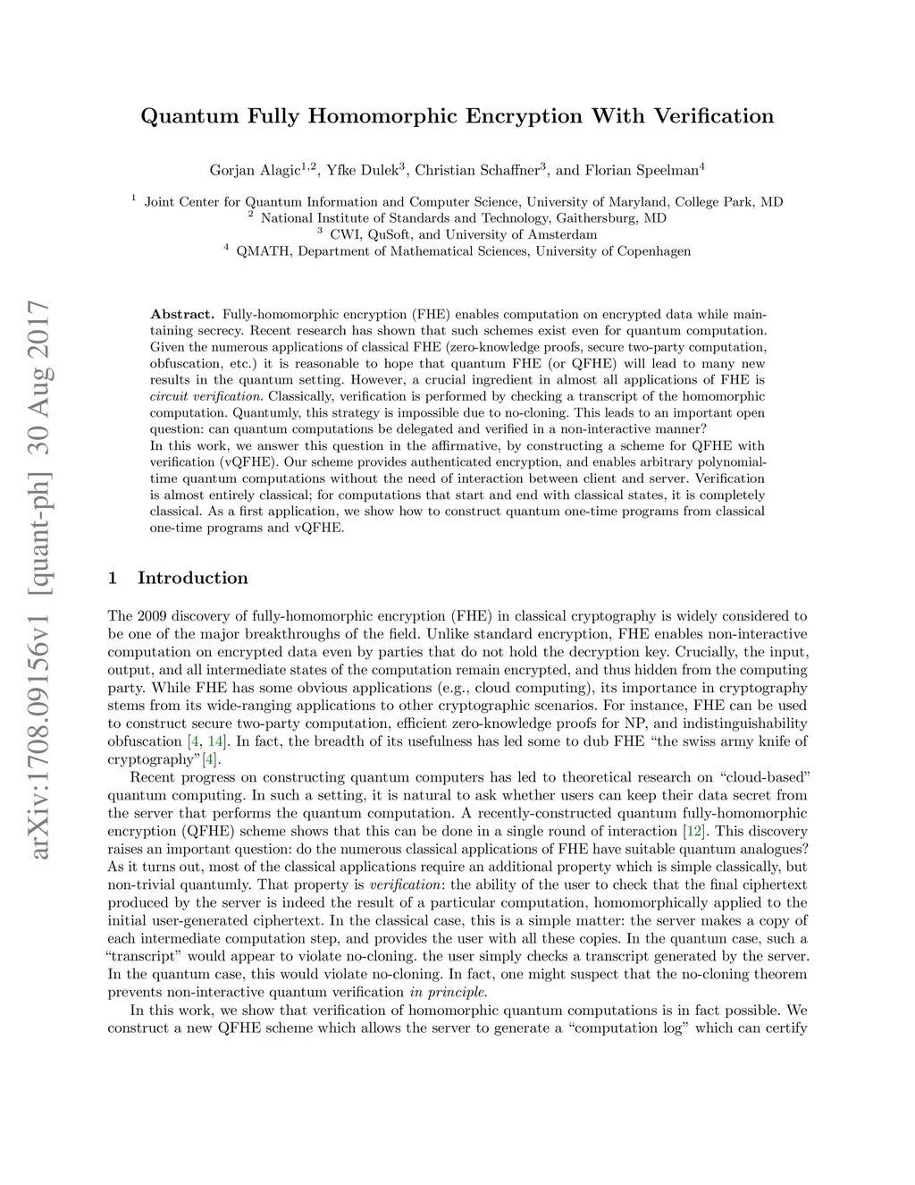 Fully-homomorphic encryption (FHE) enables computation on encrypted data while maintaining secrecy. Recent research has shown that such schemes exist even for quantum computation. Given the numerous applications of classical FHE (zero-knowledge proofs, secure two-party computation, obfuscation, etc.) it is reasonable to hope that quantum FHE (or QFHE) will lead to many new results in the quantum setting. However, a crucial ingredient in almost all applications of FHE is circuit verification. Classically, verification is performed by checking a transcript of the homomorphic computation. Quantumly, this strategy is impossible due to no-cloning. This leads to an important open question: can quantum computations be delegated and verified in a non-interactive manner? In this work, we answer this question in the affirmative, by constructing a scheme for QFHE with verification (vQFHE). Our scheme provides authenticated encryption, and enables arbitrary polynomial-time quantum computations without the need of interaction between client and server. Verification is almost entirely classical; for computations that start and end with classical states, it is completely classical. As a first application, we show how to construct quantum one-time programs from classical one-time programs and vQFHE.