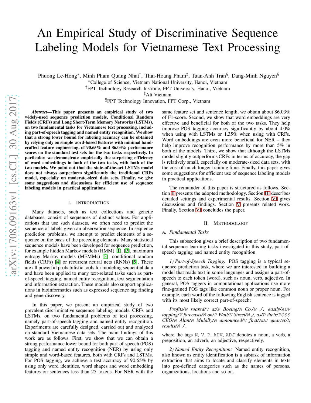 This paper presents an empirical study of two widely-used sequence prediction models, Conditional Random Fields (CRFs) and Long Short-Term Memory Networks (LSTMs), on two fundamental tasks for Vietnamese text processing, including part-of-speech tagging and named entity recognition. We show that a strong lower bound for labeling accuracy can be obtained by relying only on simple word-based features with minimal hand-crafted feature engineering, of 90.65\% and 86.03\% performance scores on the standard test sets for the two tasks respectively. In particular, we demonstrate empirically the surprising efficiency of word embeddings in both of the two tasks, with both of the two models. We point out that the state-of-the-art LSTMs model does not always outperform significantly the traditional CRFs model, especially on moderate-sized data sets. Finally, we give some suggestions and discussions for efficient use of sequence labeling models in practical applications.