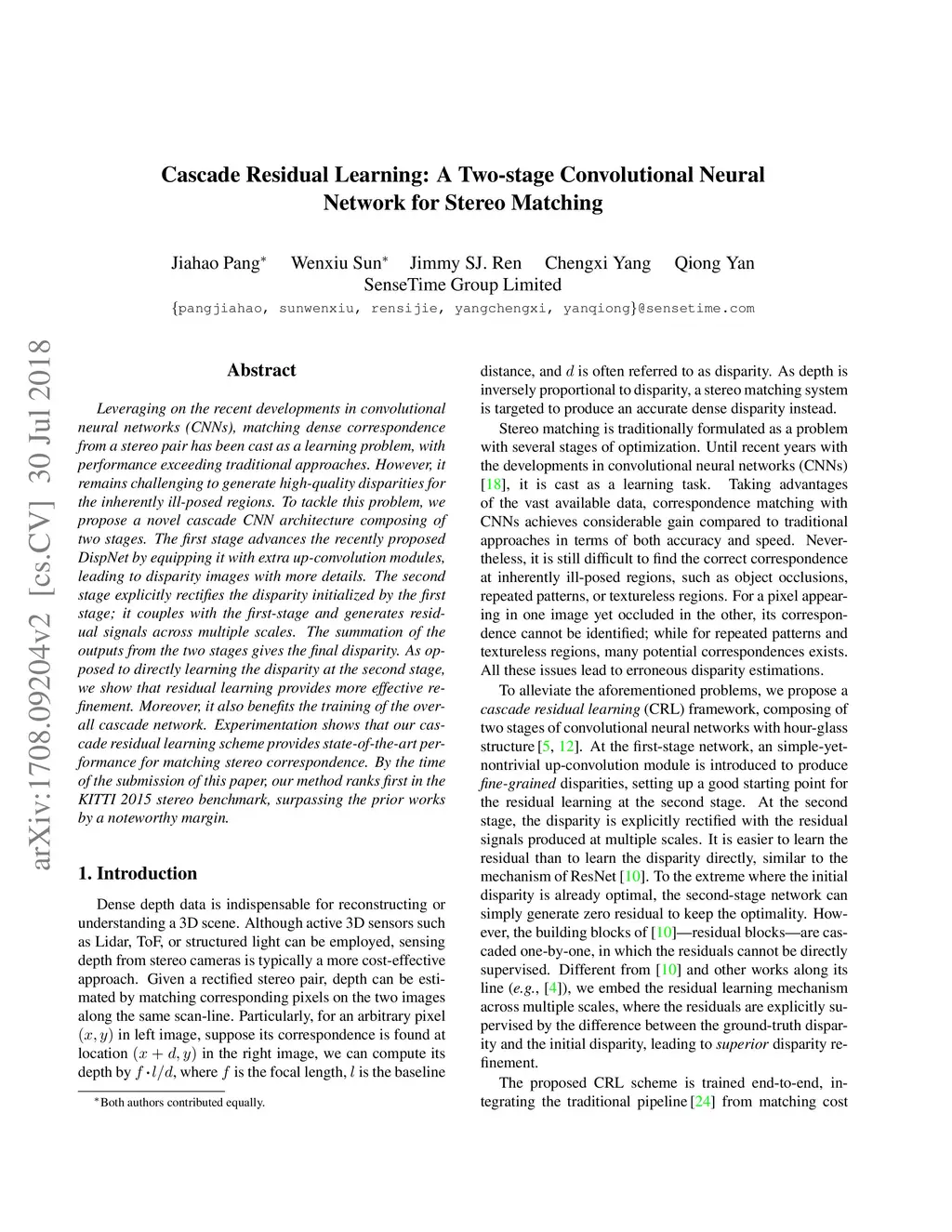Leveraging on the recent developments in convolutional neural networks (CNNs), matching dense correspondence from a stereo pair has been cast as a learning problem, with performance exceeding traditional approaches. However, it remains challenging to generate high-quality disparities for the inherently ill-posed regions. To tackle this problem, we propose a novel cascade CNN architecture composing of two stages. The first stage advances the recently proposed DispNet by equipping it with extra up-convolution modules, leading to disparity images with more details. The second stage explicitly rectifies the disparity initialized by the first stage; it couples with the first-stage and generates residual signals across multiple scales. The summation of the outputs from the two stages gives the final disparity. As opposed to directly learning the disparity at the second stage, we show that residual learning provides more effective refinement. Moreover, it also benefits the training of the overall cascade network. Experimentation shows that our cascade residual learning scheme provides state-of-the-art performance for matching stereo correspondence. By the time of the submission of this paper, our method ranks first in the KITTI 2015 stereo benchmark, surpassing the prior works by a noteworthy margin.