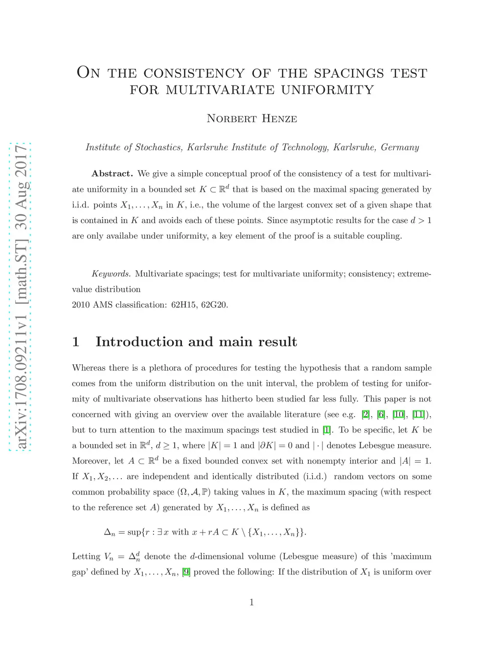 We give a simple conceptual proof of the consistency of a test for multivariate uniformity in a bounded set that is based on the maximal spacing generated by i.i.d. points in , i.e., the volume of the largest convex set of a given shape that is contained in and avoids each of these points. Since asymptotic results for the case are only availabe under uniformity, a key element of the proof is a suitable coupling.