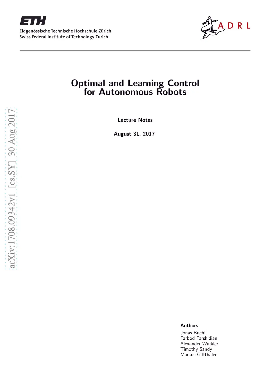 Optimal and Learning Control for Autonomous Robots has been taught in the Robotics, Systems and Controls Masters at ETH Zurich with the aim to teach optimal control and reinforcement learning for closed loop control problems from a unified point of view. The starting point is the formulation of of an optimal control problem and deriving the different types of solutions and algorithms from there. These lecture notes aim at supporting this unified view with a unified notation wherever possible, and a bit of a translation help to compare the terminology and notation in the different fields. The course assumes basic knowledge of Control Theory, Linear Algebra and Stochastic Calculus.