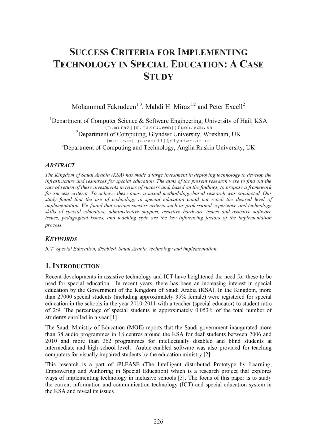 The Kingdom of Saudi Arabia (KSA) has made a large investment in deploying technology to develop the infrastructure and resources for special education. The aims of the present research were to find out the rate of return of these investments in terms of success and, based on the findings, to propose a framework for success criteria. To achieve these aims, a mixed methodology-based research was conducted. Our study found that the use of technology in special education could not reach the desired level of implementation. We found that various success criteria such as professional experience and technology skills of special educators, administrative support, assistive hardware issues and assistive software issues, pedagogical issues, and teaching style are the key influencing factors of the implementation process.