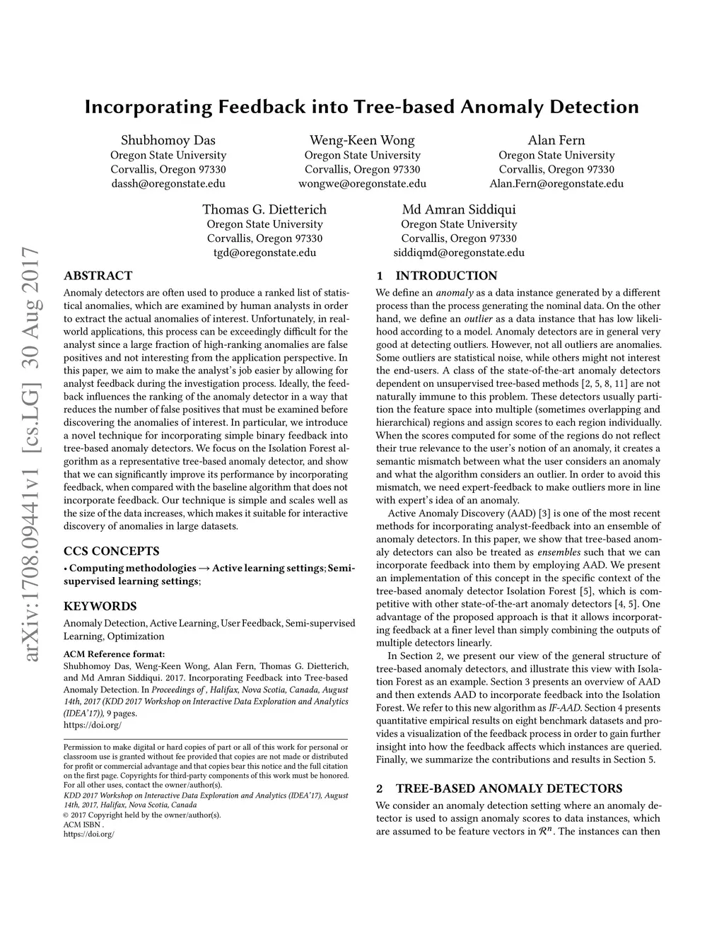 Anomaly detectors are often used to produce a ranked list of statistical anomalies, which are examined by human analysts in order to extract the actual anomalies of interest. Unfortunately, in realworld applications, this process can be exceedingly difficult for the analyst since a large fraction of high-ranking anomalies are false positives and not interesting from the application perspective. In this paper, we aim to make the analyst's job easier by allowing for analyst feedback during the investigation process. Ideally, the feedback influences the ranking of the anomaly detector in a way that reduces the number of false positives that must be examined before discovering the anomalies of interest. In particular, we introduce a novel technique for incorporating simple binary feedback into tree-based anomaly detectors. We focus on the Isolation Forest algorithm as a representative tree-based anomaly detector, and show that we can significantly improve its performance by incorporating feedback, when compared with the baseline algorithm that does not incorporate feedback. Our technique is simple and scales well as the size of the data increases, which makes it suitable for interactive discovery of anomalies in large datasets.