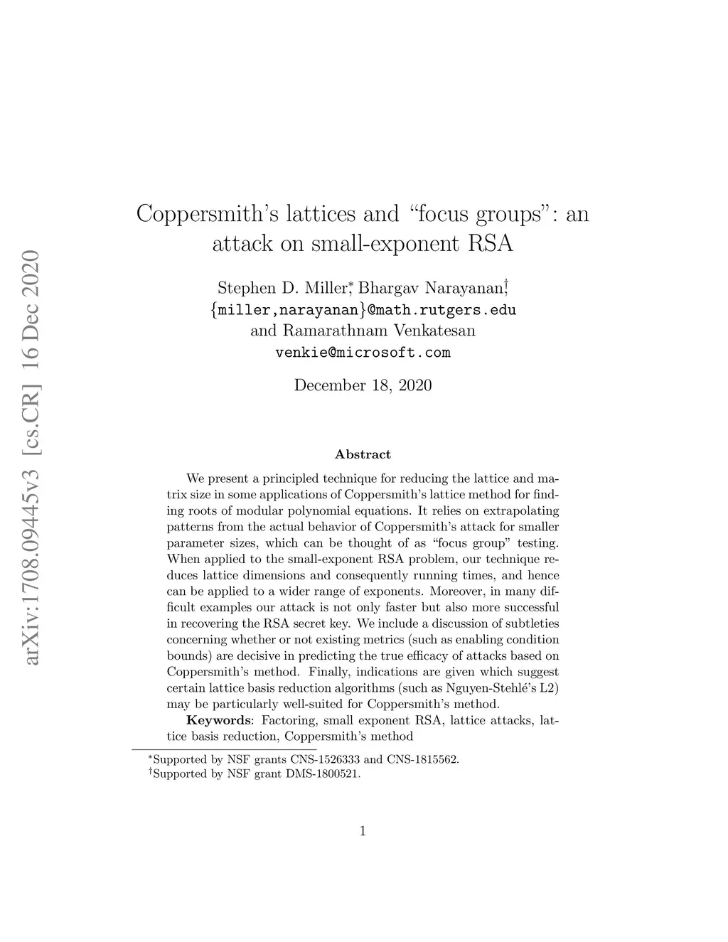 Coppersmith's lattices and "focus groups": an attack on small-exponent