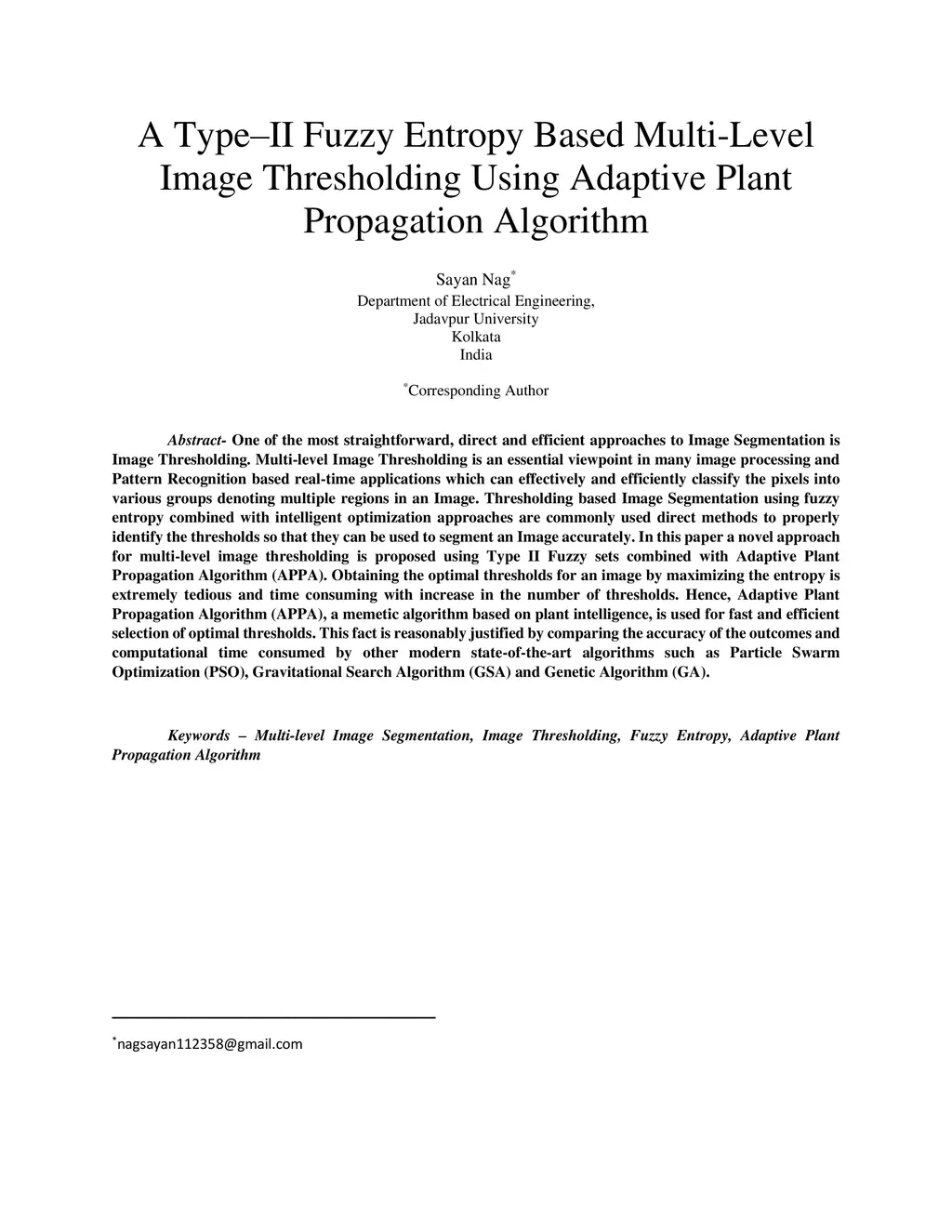 One of the most straightforward, direct and efficient approaches to Image Segmentation is Image Thresholding. Multi-level Image Thresholding is an essential viewpoint in many image processing and Pattern Recognition based real-time applications which can effectively and efficiently classify the pixels into various groups denoting multiple regions in an Image. Thresholding based Image Segmentation using fuzzy entropy combined with intelligent optimization approaches are commonly used direct methods to properly identify the thresholds so that they can be used to segment an Image accurately. In this paper a novel approach for multi-level image thresholding is proposed using Type II Fuzzy sets combined with Adaptive Plant Propagation Algorithm (APPA). Obtaining the optimal thresholds for an image by maximizing the entropy is extremely tedious and time consuming with increase in the number of thresholds. Hence, Adaptive Plant Propagation Algorithm (APPA), a memetic algorithm based on plant intelligence, is used for fast and efficient selection of optimal thresholds. This fact is reasonably justified by comparing the accuracy of the outcomes and computational time consumed by other modern state-of-the-art algorithms such as Particle Swarm Optimization (PSO), Gravitational Search Algorithm (GSA) and Genetic Algorithm (GA).