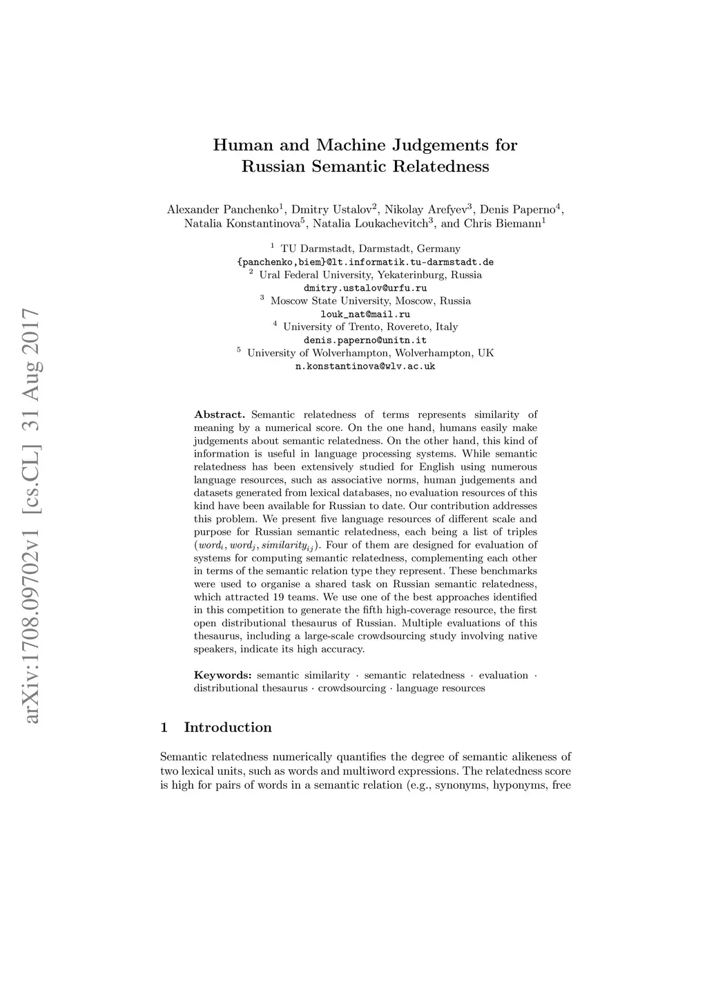 Semantic relatedness of terms represents similarity of meaning by a numerical score. On the one hand, humans easily make judgments about semantic relatedness. On the other hand, this kind of information is useful in language processing systems. While semantic relatedness has been extensively studied for English using numerous language resources, such as associative norms, human judgments, and datasets generated from lexical databases, no evaluation resources of this kind have been available for Russian to date. Our contribution addresses this problem. We present five language resources of different scale and purpose for Russian semantic relatedness, each being a list of triples (word_i, word_j, relatedness_ij). Four of them are designed for evaluation of systems for computing semantic relatedness, complementing each other in terms of the semantic relation type they represent. These benchmarks were used to organize a shared task on Russian semantic relatedness, which attracted 19 teams. We use one of the best approaches identified in this competition to generate the fifth high-coverage resource, the first open distributional thesaurus of Russian. Multiple evaluations of this thesaurus, including a large-scale crowdsourcing study involving native speakers, indicate its high accuracy.