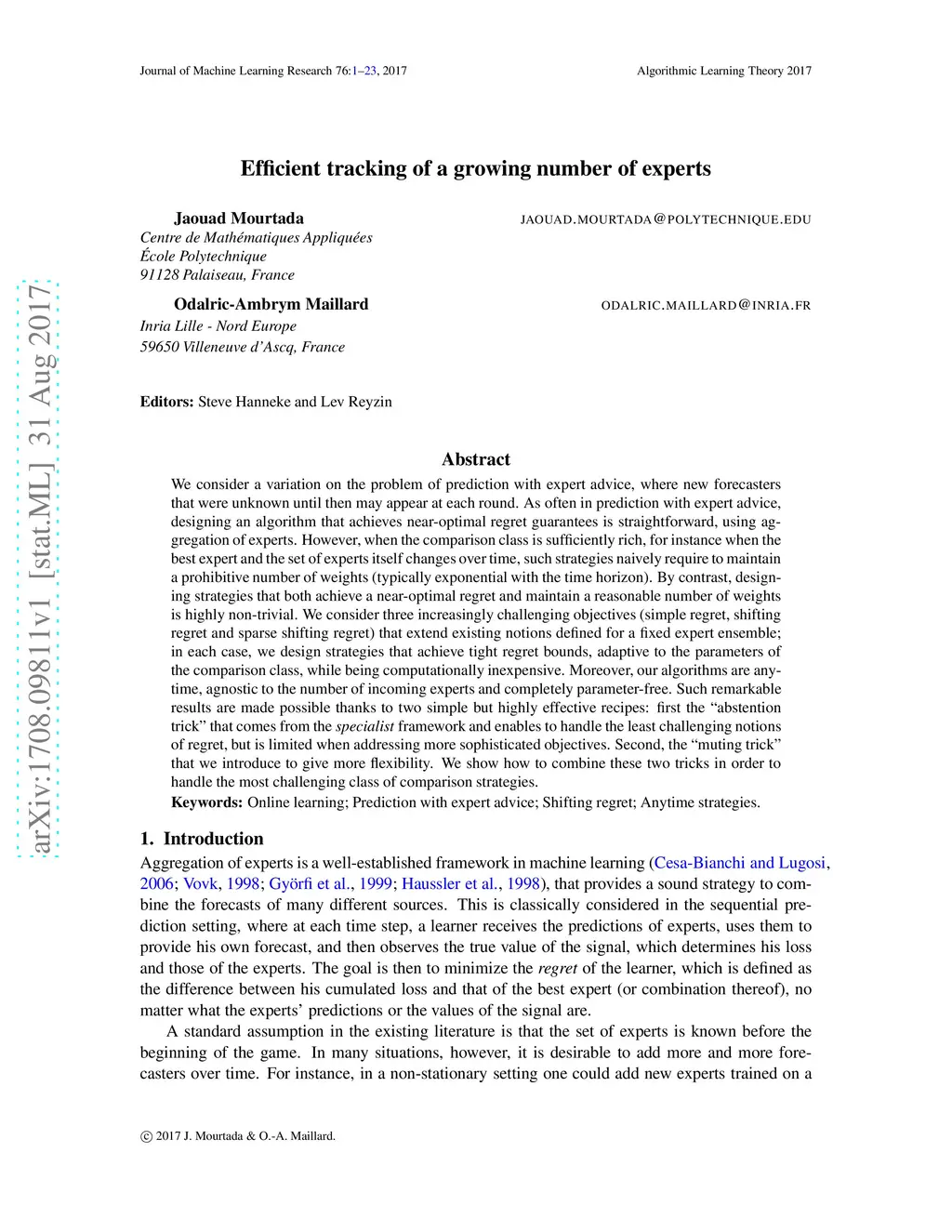 We consider a variation on the problem of prediction with expert advice, where new forecasters that were unknown until then may appear at each round. As often in prediction with expert advice, designing an algorithm that achieves near-optimal regret guarantees is straightforward, using aggregation of experts. However, when the comparison class is sufficiently rich, for instance when the best expert and the set of experts itself changes over time, such strategies naively require to maintain a prohibitive number of weights (typically exponential with the time horizon). By contrast, designing strategies that both achieve a near-optimal regret and maintain a reasonable number of weights is highly non-trivial. We consider three increasingly challenging objectives (simple regret, shifting regret and sparse shifting regret) that extend existing notions defined for a fixed expert ensemble; in each case, we design strategies that achieve tight regret bounds, adaptive to the parameters of the comparison class, while being computationally inexpensive. Moreover, our algorithms are anytime, agnostic to the number of incoming experts and completely parameter-free. Such remarkable results are made possible thanks to two simple but highly effective recipes: first the "abstention trick" that comes from the specialist framework and enables to handle the least challenging notions of regret, but is limited when addressing more sophisticated objectives. Second, the "muting trick" that we introduce to give more flexibility. We show how to combine these two tricks in order to handle the most challenging class of comparison strategies.