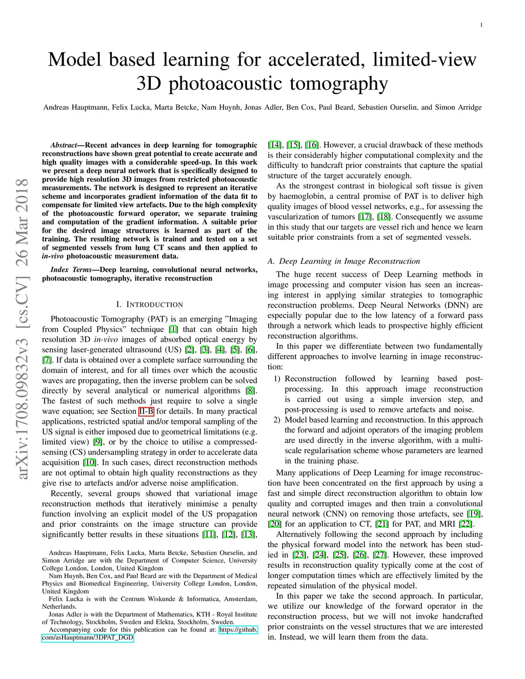 Model based learning for accelerated, limited-view 3D photoacoustic