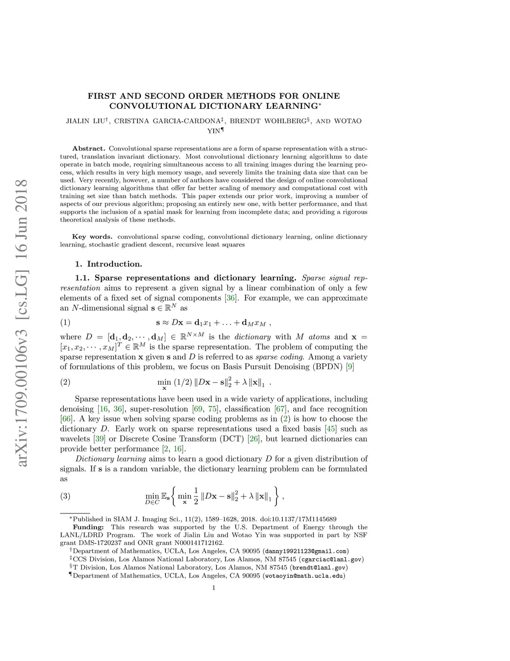 Convolutional sparse representations are a form of sparse representation with a structured, translation invariant dictionary. Most convolutional dictionary learning algorithms to date operate in batch mode, requiring simultaneous access to all training images during the learning process, which results in very high memory usage and severely limits the training data that can be used. Very recently, however, a number of authors have considered the design of online convolutional dictionary learning algorithms that offer far better scaling of memory and computational cost with training set size than batch methods. This paper extends our prior work, improving a number of aspects of our previous algorithm; proposing an entirely new one, with better performance, and that supports the inclusion of a spatial mask for learning from incomplete data; and providing a rigorous theoretical analysis of these methods.