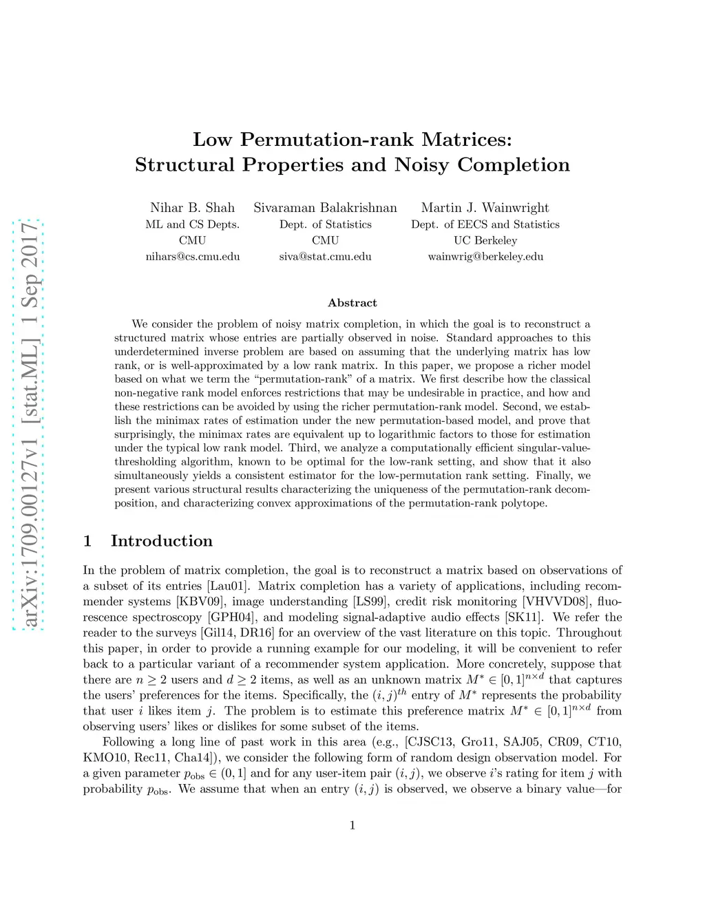 We consider the problem of noisy matrix completion, in which the goal is to reconstruct a structured matrix whose entries are partially observed in noise. Standard approaches to this underdetermined inverse problem are based on assuming that the underlying matrix has low rank, or is well-approximated by a low rank matrix. In this paper, we propose a richer model based on what we term the "permutation-rank" of a matrix. We first describe how the classical non-negative rank model enforces restrictions that may be undesirable in practice, and how and these restrictions can be avoided by using the richer permutation-rank model. Second, we establish the minimax rates of estimation under the new permutation-based model, and prove that surprisingly, the minimax rates are equivalent up to logarithmic factors to those for estimation under the typical low rank model. Third, we analyze a computationally efficient singular-value-thresholding algorithm, known to be optimal for the low-rank setting, and show that it also simultaneously yields a consistent estimator for the low-permutation rank setting. Finally, we present various structural results characterizing the uniqueness of the permutation-rank decomposition, and characterizing convex approximations of the permutation-rank polytope.