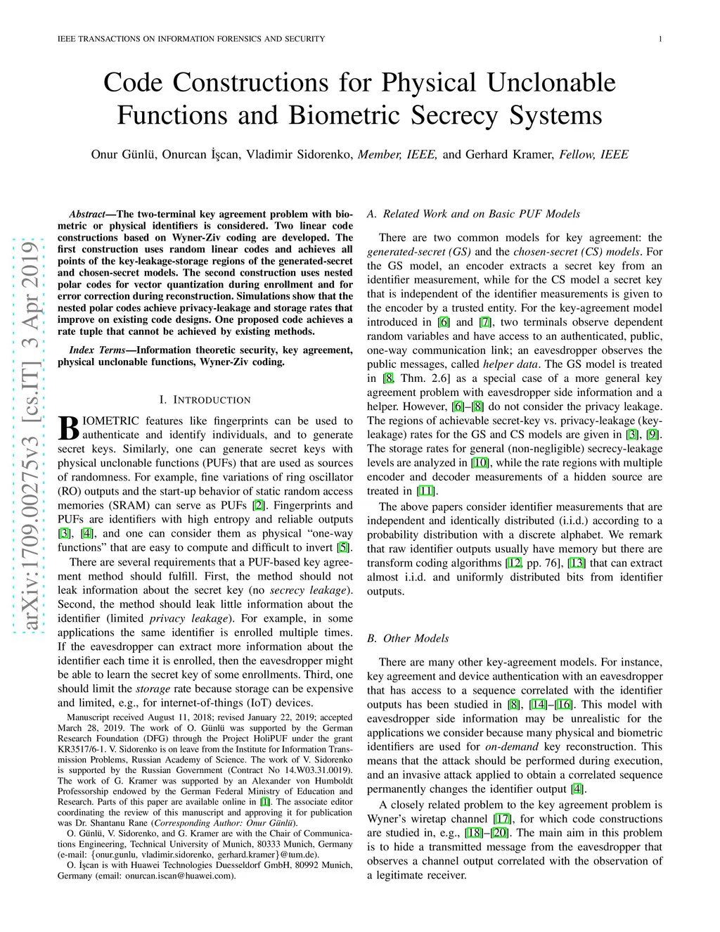The two-terminal key agreement problem with biometric or physical identifiers is considered. Two linear code constructions based on Wyner-Ziv coding are developed. The first construction uses random linear codes and achieves all points of the key-leakage-storage regions of the generated-secret and chosen-secret models. The second construction uses nested polar codes for vector quantization during enrollment and for error correction during reconstruction. Simulations show that the nested polar codes achieve privacy-leakage and storage rates that improve on existing code designs. One proposed code achieves a rate tuple that cannot be achieved by existing methods.