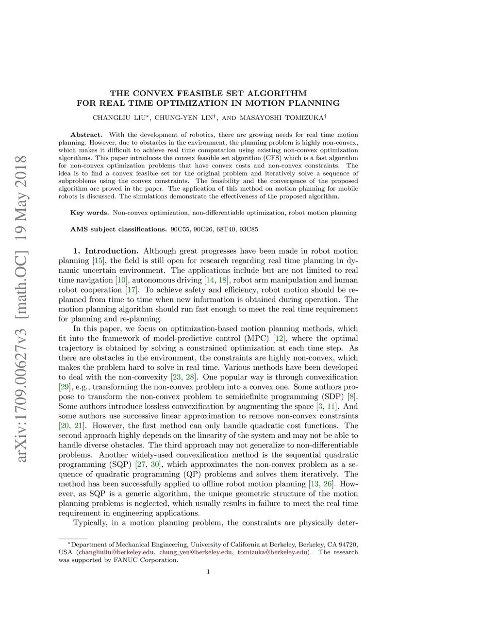 With the development of robotics, there are growing needs for real time motion planning. However, due to obstacles in the environment, the planning problem is highly non-convex, which makes it difficult to achieve real time computation using existing non-convex optimization algorithms. This paper introduces the convex feasible set algorithm (CFS) which is a fast algorithm for non-convex optimization problems that have convex costs and non-convex constraints. The idea is to find a convex feasible set for the original problem and iteratively solve a sequence of subproblems using the convex constraints. The feasibility and the convergence of the proposed algorithm are proved in the paper. The application of this method on motion planning for mobile robots is discussed. The simulations demonstrate the effectiveness of the proposed algorithm.