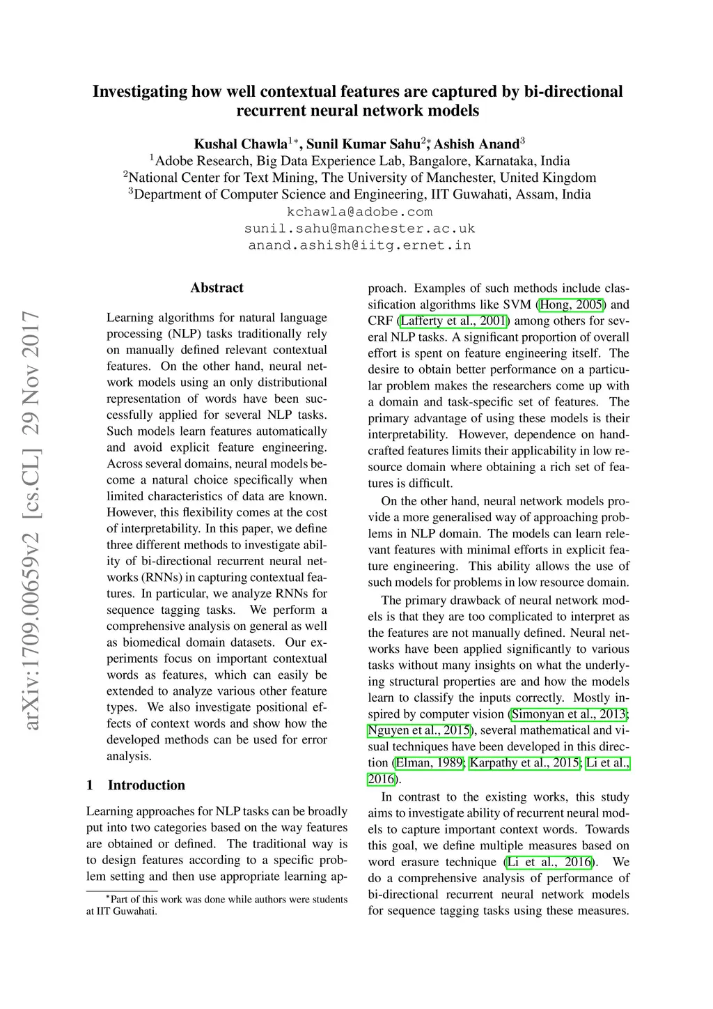 Learning algorithms for natural language processing (NLP) tasks traditionally rely on manually defined relevant contextual features. On the other hand, neural network models using an only distributional representation of words have been successfully applied for several NLP tasks. Such models learn features automatically and avoid explicit feature engineering. Across several domains, neural models become a natural choice specifically when limited characteristics of data are known. However, this flexibility comes at the cost of interpretability. In this paper, we define three different methods to investigate ability of bi-directional recurrent neural networks (RNNs) in capturing contextual features. In particular, we analyze RNNs for sequence tagging tasks. We perform a comprehensive analysis on general as well as biomedical domain datasets. Our experiments focus on important contextual words as features, which can easily be extended to analyze various other feature types. We also investigate positional effects of context words and show how the developed methods can be used for error analysis.