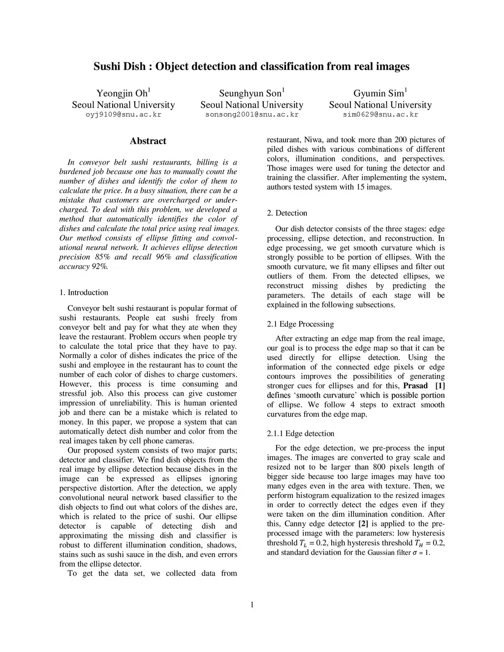 In conveyor belt sushi restaurants, billing is a burdened job because one has to manually count the number of dishes and identify the color of them to calculate the price. In a busy situation, there can be a mistake that customers are overcharged or under-charged. To deal with this problem, we developed a method that automatically identifies the color of dishes and calculate the total price using real images. Our method consists of ellipse fitting and convol-utional neural network. It achieves ellipse detection precision 85% and recall 96% and classification accuracy 92%.