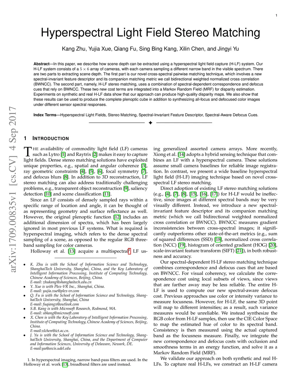 In this paper, we describe how scene depth can be extracted using a hyperspectral light field capture (H-LF) system. Our H-LF system consists of a 5 x 6 array of cameras, with each camera sampling a different narrow band in the visible spectrum. There are two parts to extracting scene depth. The first part is our novel cross-spectral pairwise matching technique, which involves a new spectral-invariant feature descriptor and its companion matching metric we call bidirectional weighted normalized cross correlation (BWNCC). The second part, namely, H-LF stereo matching, uses a combination of spectral-dependent correspondence and defocus cues that rely on BWNCC. These two new cost terms are integrated into a Markov Random Field (MRF) for disparity estimation. Experiments on synthetic and real H-LF data show that our approach can produce high-quality disparity maps. We also show that these results can be used to produce the complete plenoptic cube in addition to synthesizing all-focus and defocused color images under different sensor spectral responses.