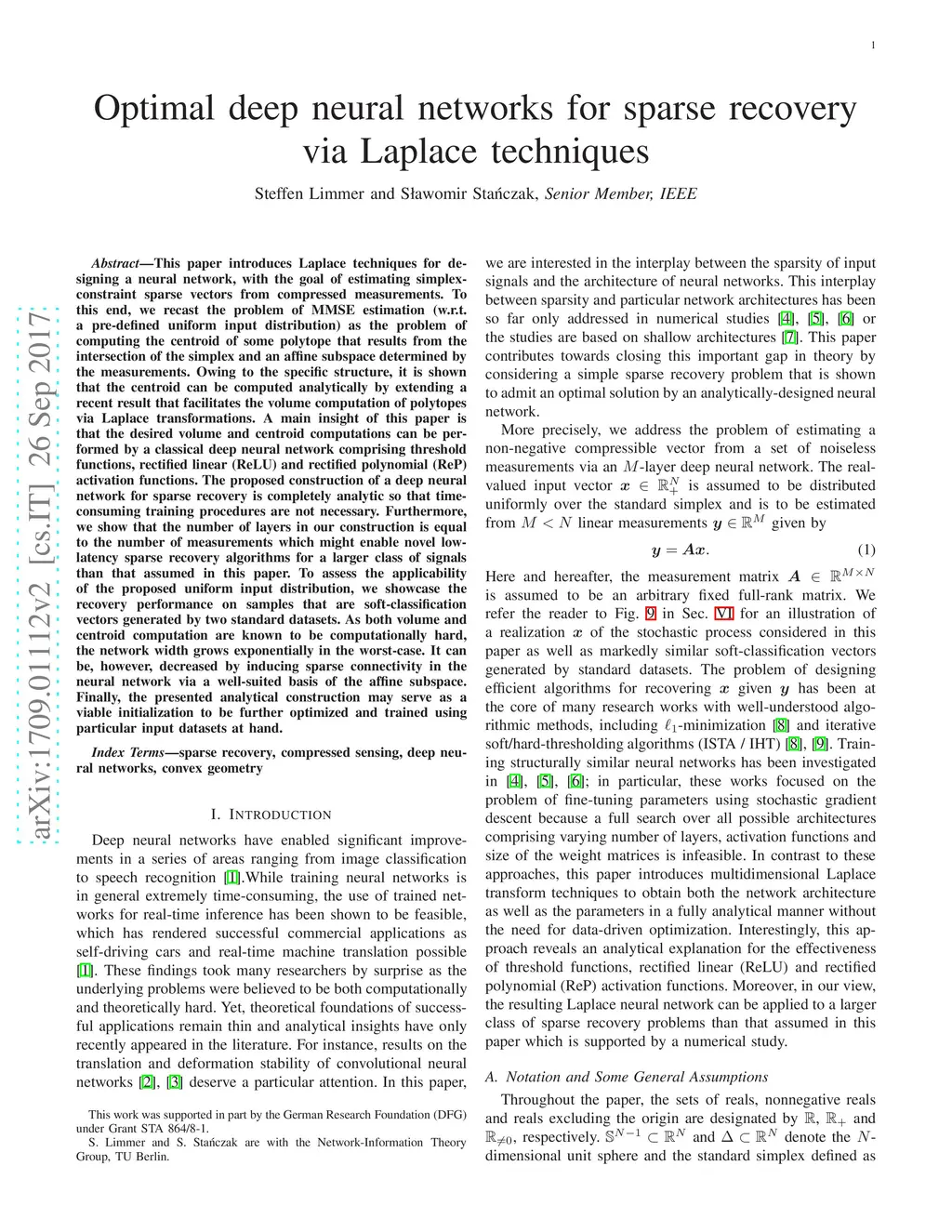This paper introduces Laplace techniques for designing a neural network, with the goal of estimating simplex-constraint sparse vectors from compressed measurements. To this end, we recast the problem of MMSE estimation (w.r.t. a pre-defined uniform input distribution) as the problem of computing the centroid of some polytope that results from the intersection of the simplex and an affine subspace determined by the measurements. Owing to the specific structure, it is shown that the centroid can be computed analytically by extending a recent result that facilitates the volume computation of polytopes via Laplace transformations. A main insight of this paper is that the desired volume and centroid computations can be performed by a classical deep neural network comprising threshold functions, rectified linear (ReLU) and rectified polynomial (ReP) activation functions. The proposed construction of a deep neural network for sparse recovery is completely analytic so that time-consuming training procedures are not necessary. Furthermore, we show that the number of layers in our construction is equal to the number of measurements which might enable novel low-latency sparse recovery algorithms for a larger class of signals than that assumed in this paper. To assess the applicability of the proposed uniform input distribution, we showcase the recovery performance on samples that are soft-classification vectors generated by two standard datasets. As both volume and centroid computation are known to be computationally hard, the network width grows exponentially in the worst-case. It can be, however, decreased by inducing sparse connectivity in the neural network via a well-suited basis of the affine subspace. Finally, the presented analytical construction may serve as a viable initialization to be further optimized and trained using particular input datasets at hand.