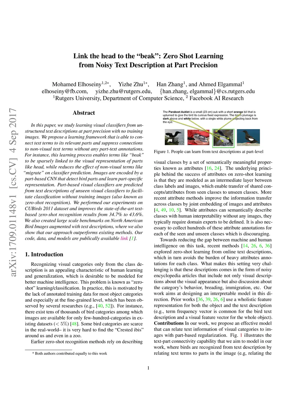 In this paper, we study learning visual classifiers from unstructured text descriptions at part precision with no training images. We propose a learning framework that is able to connect text terms to its relevant parts and suppress connections to non-visual text terms without any part-text annotations. For instance, this learning process enables terms like "beak" to be sparsely linked to the visual representation of parts like head, while reduces the effect of non-visual terms like "migrate" on classifier prediction. Images are encoded by a part-based CNN that detect bird parts and learn part-specific representation. Part-based visual classifiers are predicted from text descriptions of unseen visual classifiers to facilitate classification without training images (also known as zero-shot recognition). We performed our experiments on CUBirds 2011 dataset and improves the state-of-the-art text-based zero-shot recognition results from 34.7\% to 43.6\%. We also created large scale benchmarks on North American Bird Images augmented with text descriptions, where we also show that our approach outperforms existing methods. Our code, data, and models are publically available.