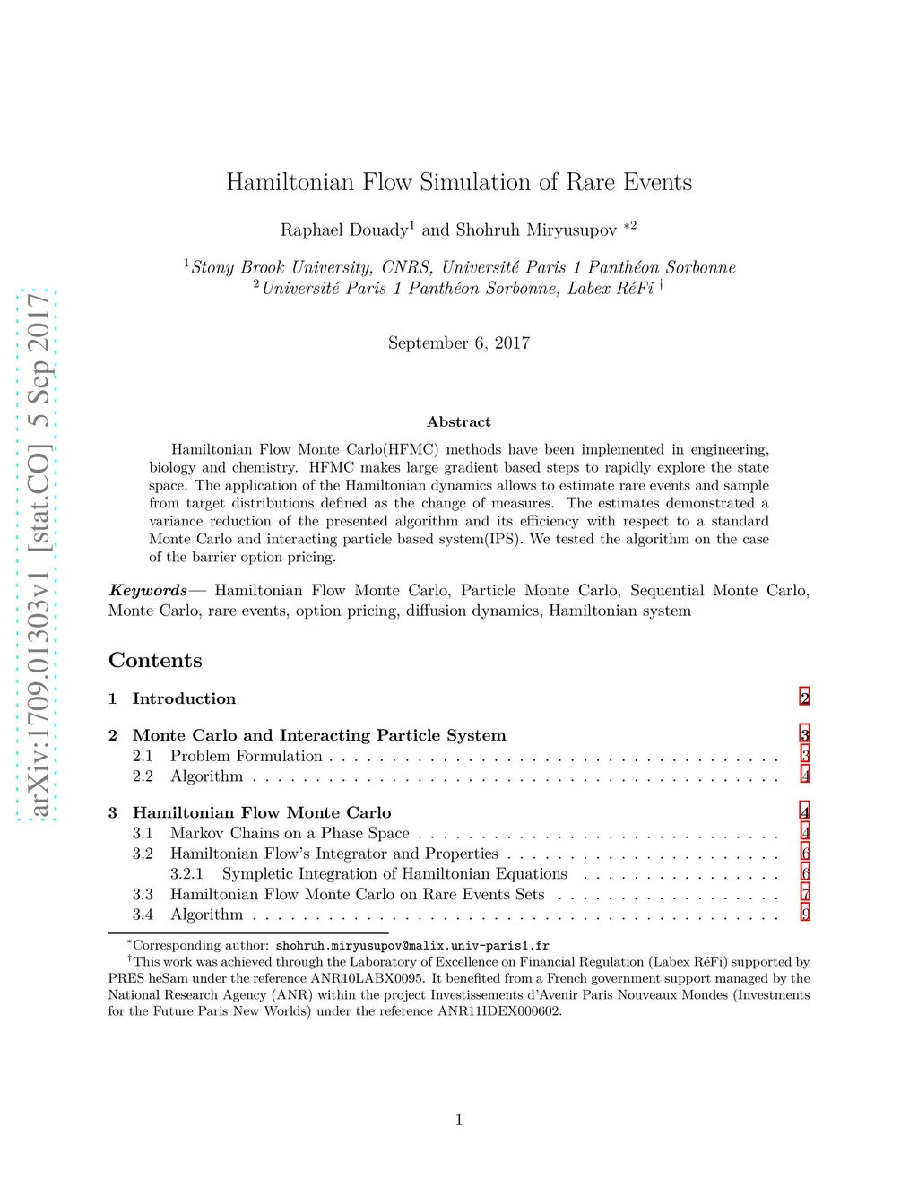 Hamiltonian Flow Monte Carlo(HFMC) methods have been implemented in engineering, biology and chemistry. HFMC makes large gradient based steps to rapidly explore the state space. The application of the Hamiltonian dynamics allows to estimate rare events and sample from target distributions defined as the change of measures. The estimates demonstrated a variance reduction of the presented algorithm and its efficiency with respect to a standard Monte Carlo and interacting particle based system(IPS). We tested the algorithm on the case of the barrier option pricing.