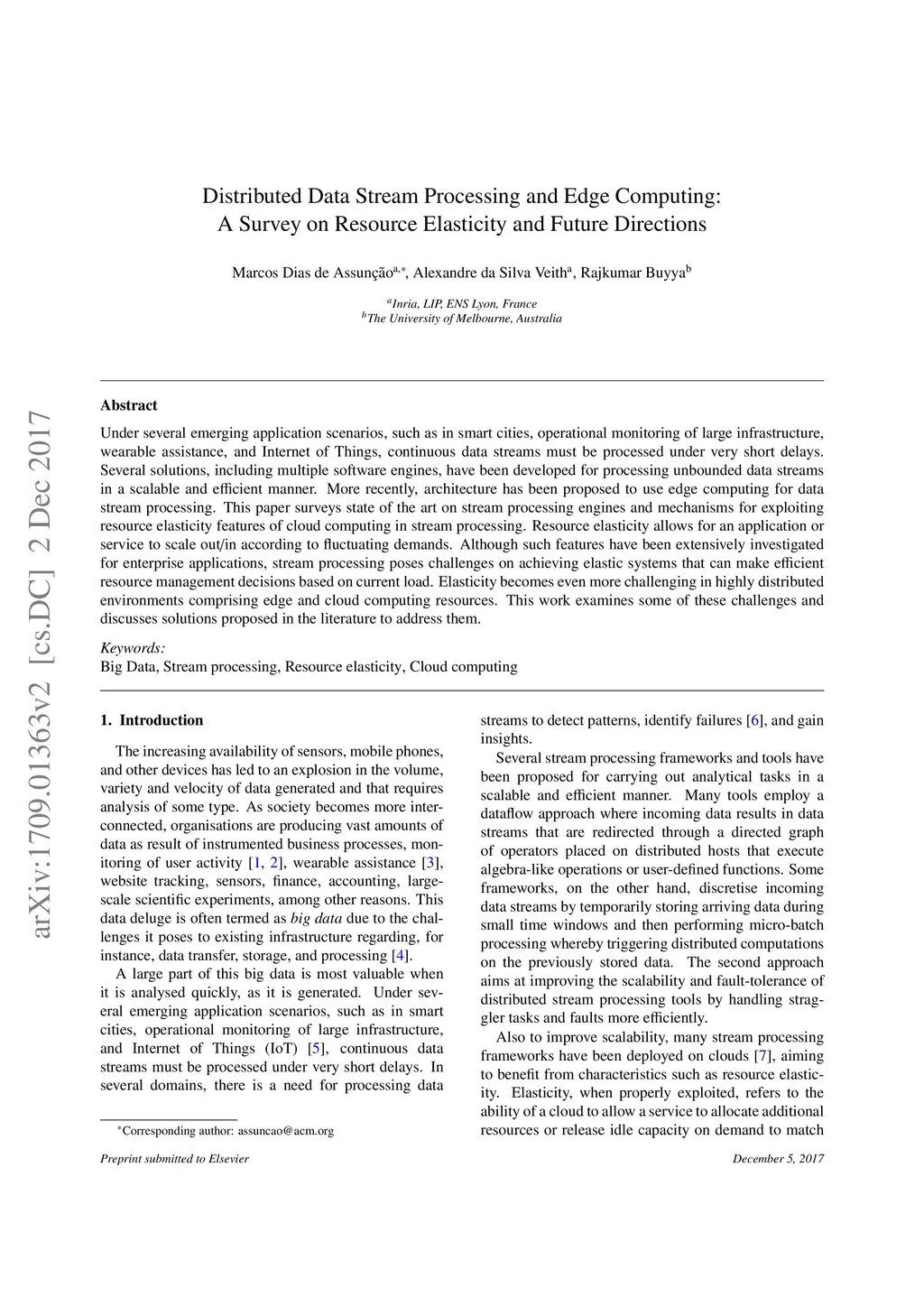 Under several emerging application scenarios, such as in smart cities, operational monitoring of large infrastructure, wearable assistance, and Internet of Things, continuous data streams must be processed under very short delays. Several solutions, including multiple software engines, have been developed for processing unbounded data streams in a scalable and efficient manner. More recently, architecture has been proposed to use edge computing for data stream processing. This paper surveys state of the art on stream processing engines and mechanisms for exploiting resource elasticity features of cloud computing in stream processing. Resource elasticity allows for an application or service to scale out/in according to fluctuating demands. Although such features have been extensively investigated for enterprise applications, stream processing poses challenges on achieving elastic systems that can make efficient resource management decisions based on current load. Elasticity becomes even more challenging in highly distributed environments comprising edge and cloud computing resources. This work examines some of these challenges and discusses solutions proposed in the literature to address them.
