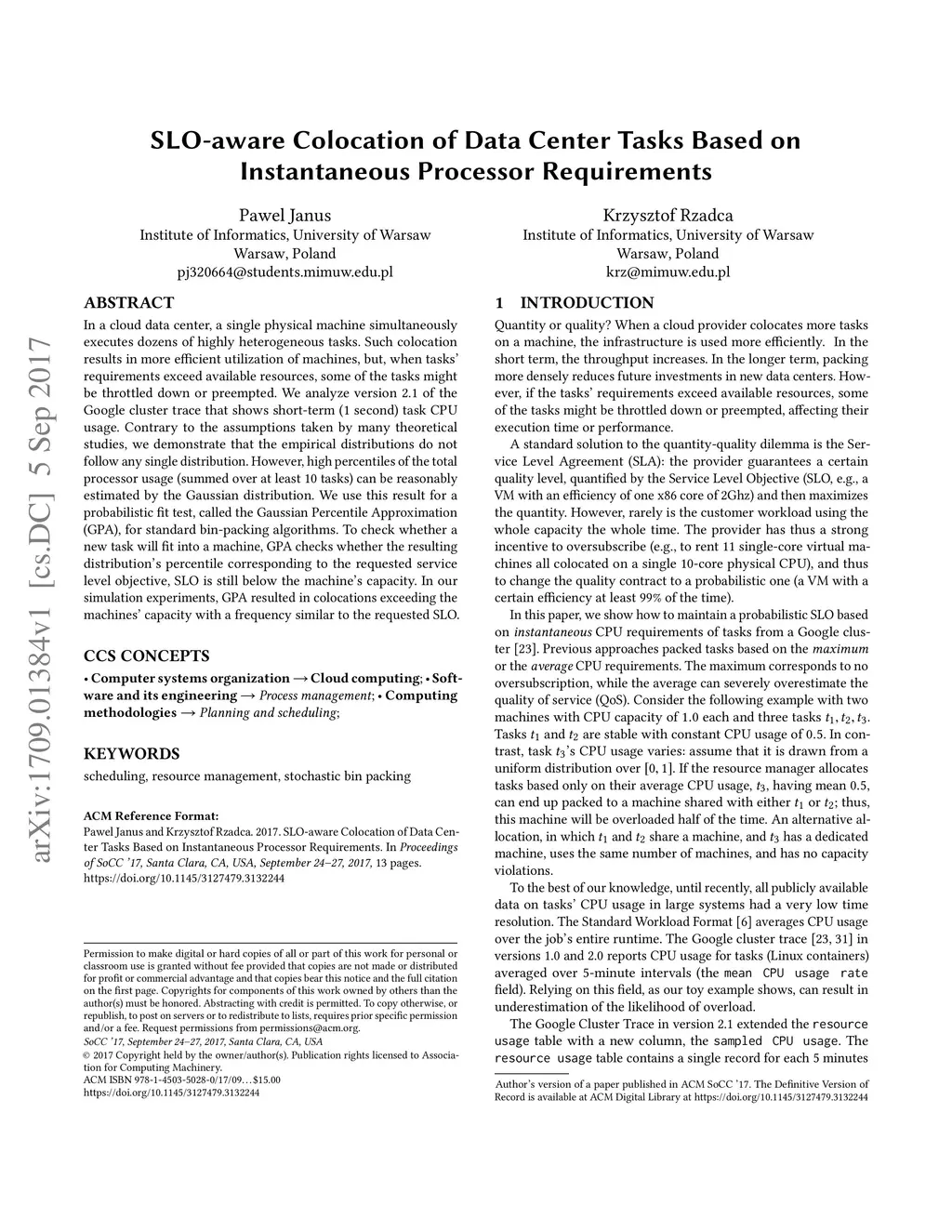 In a cloud data center, a single physical machine simultaneously executes dozens of highly heterogeneous tasks. Such colocation results in more efficient utilization of machines, but, when tasks' requirements exceed available resources, some of the tasks might be throttled down or preempted. We analyze version 2.1 of the Google cluster trace that shows short-term (1 second) task CPU usage. Contrary to the assumptions taken by many theoretical studies, we demonstrate that the empirical distributions do not follow any single distribution. However, high percentiles of the total processor usage (summed over at least 10 tasks) can be reasonably estimated by the Gaussian distribution. We use this result for a probabilistic fit test, called the Gaussian Percentile Approximation (GPA), for standard bin-packing algorithms. To check whether a new task will fit into a machine, GPA checks whether the resulting distribution's percentile corresponding to the requested service level objective, SLO is still below the machine's capacity. In our simulation experiments, GPA resulted in colocations exceeding the machines' capacity with a frequency similar to the requested SLO.